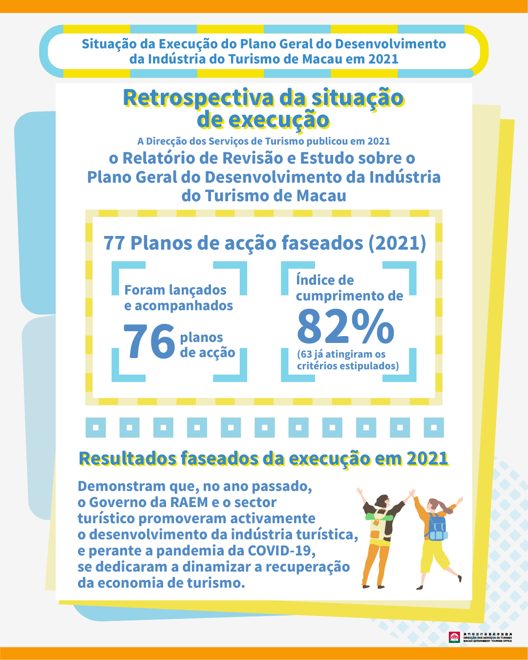 A Direcção dos Serviços de Turismo (DST) divulga a situação da execução do Plano Geral do Desenvolvimento da Indústria do Turismo de Macau em 2021. De entre os 77 planos de acção faseados, 76 já foram iniciados e acompanhados, dos quais 63 já atingiram os critérios estipulados, tendo-se atingindo um índice de cumprimento de 82%.