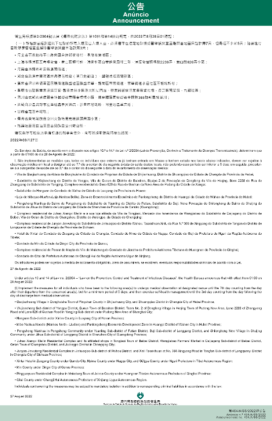 Tendo em consideração a evolução epidemiológica mais actualizada no Interior da China, os Serviços de Saúde, de acordo com o disposto nos artigos 10.º e 14.º da Lei n.º 2/2004 (Lei de Prevenção, Controlo e Tratamento de Doenças Transmissíveis), determinam que a partir da 01h00 do dia 28 de Agosto de 2022, são implementadas ou canceladas as medidas antiepidémicas para quem tenha estado em diversas áreas do Interior da China: