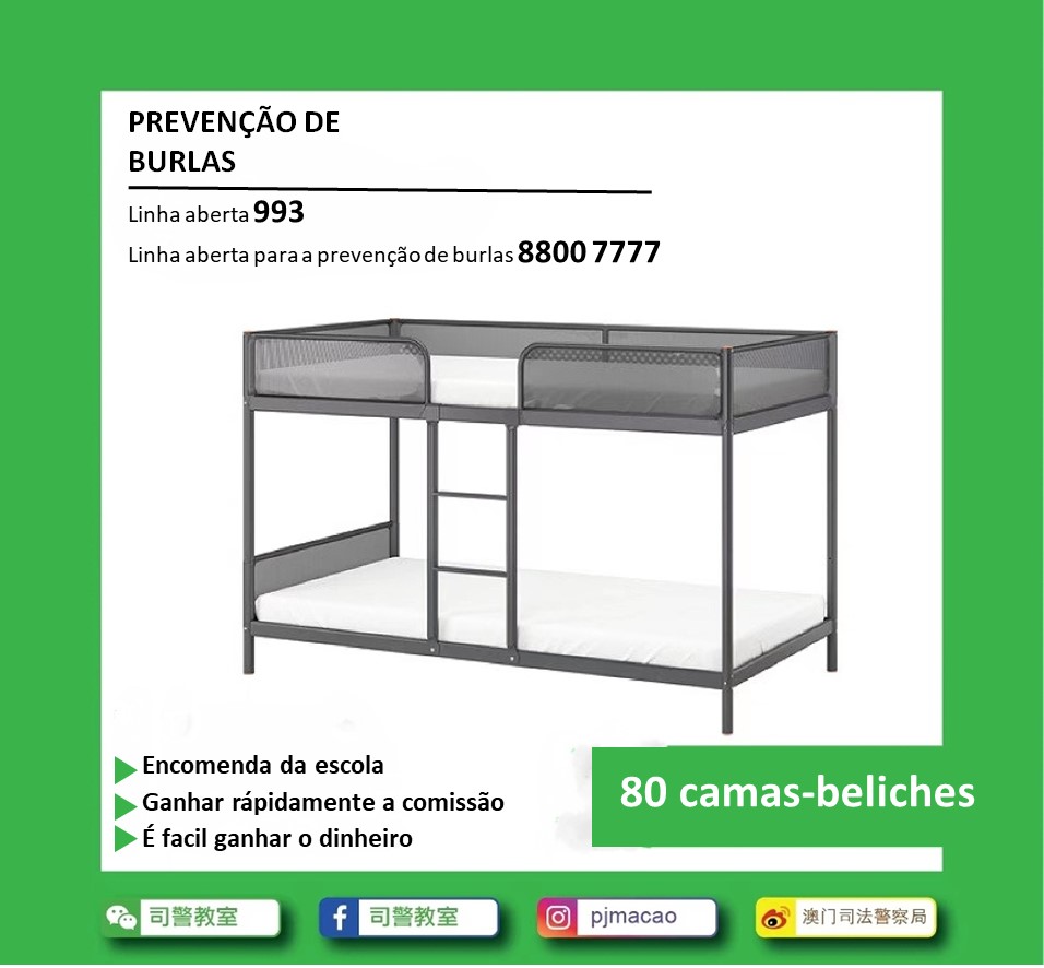 A Polícia Judiciária recebeu denúncia de que alguém, dizendo-se ser funcionário de uma escola de Macau tinha telefonado a uma loja de mobiliário, alegando que a escola precisava encomendar grande quantidade de camas-beliches e colchões. Mais tarde, a mesma pessoa indicou à loja de mobiliário um fornecedor, que mais tarde veio a saber-se falso, para se fazer a encomenda dos colchões, dizendo ainda que a loja de mobiliário podia ganhar uma comissão. Depois do pagamento de um sinal através de uma transferência bancária, a vítima telefonou àquela escola e foi informada que não houve esta encomenda. Como a vítima não conseguiu contactar com o burlão nem o fornecedor falso, pediu ajuda à polícia.