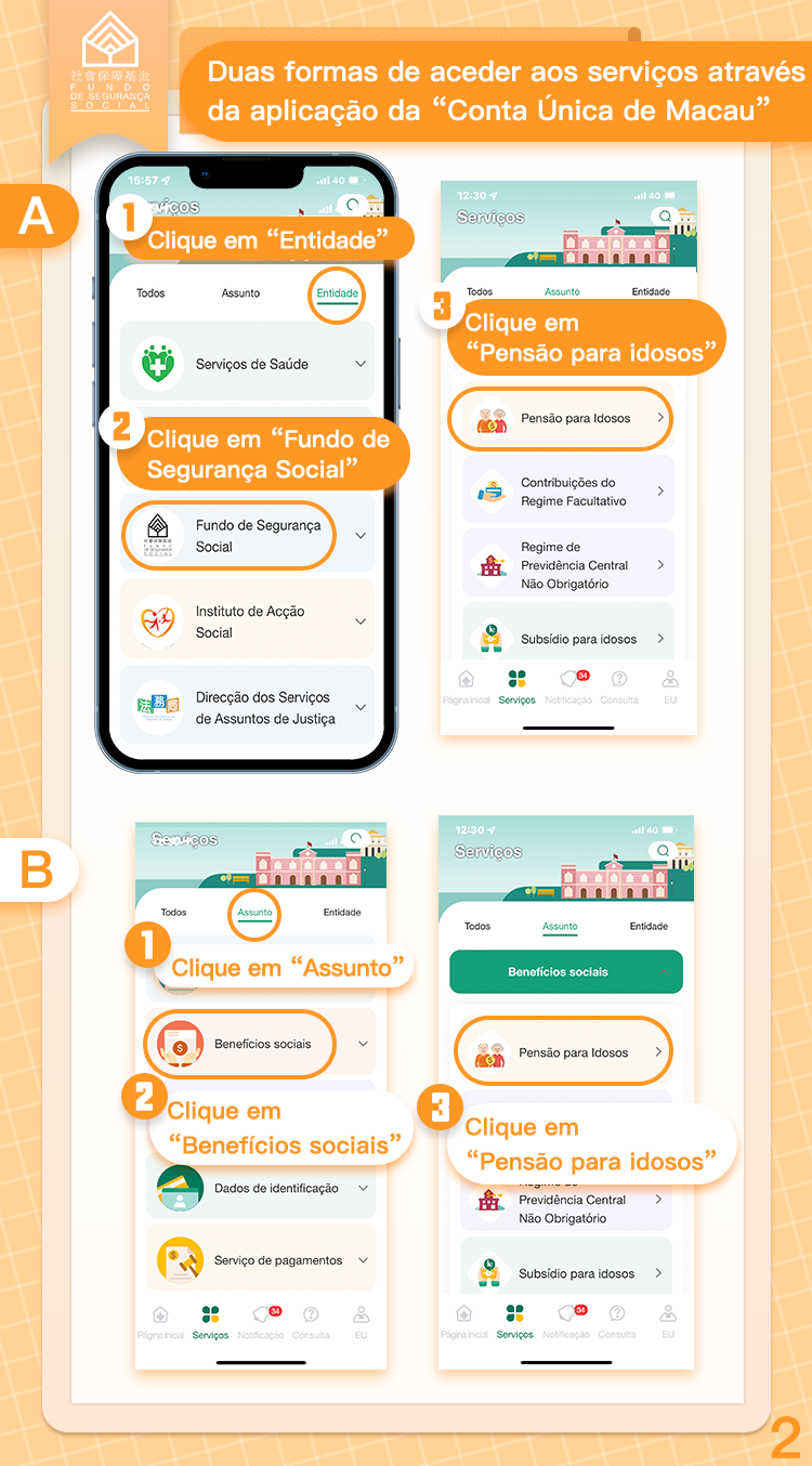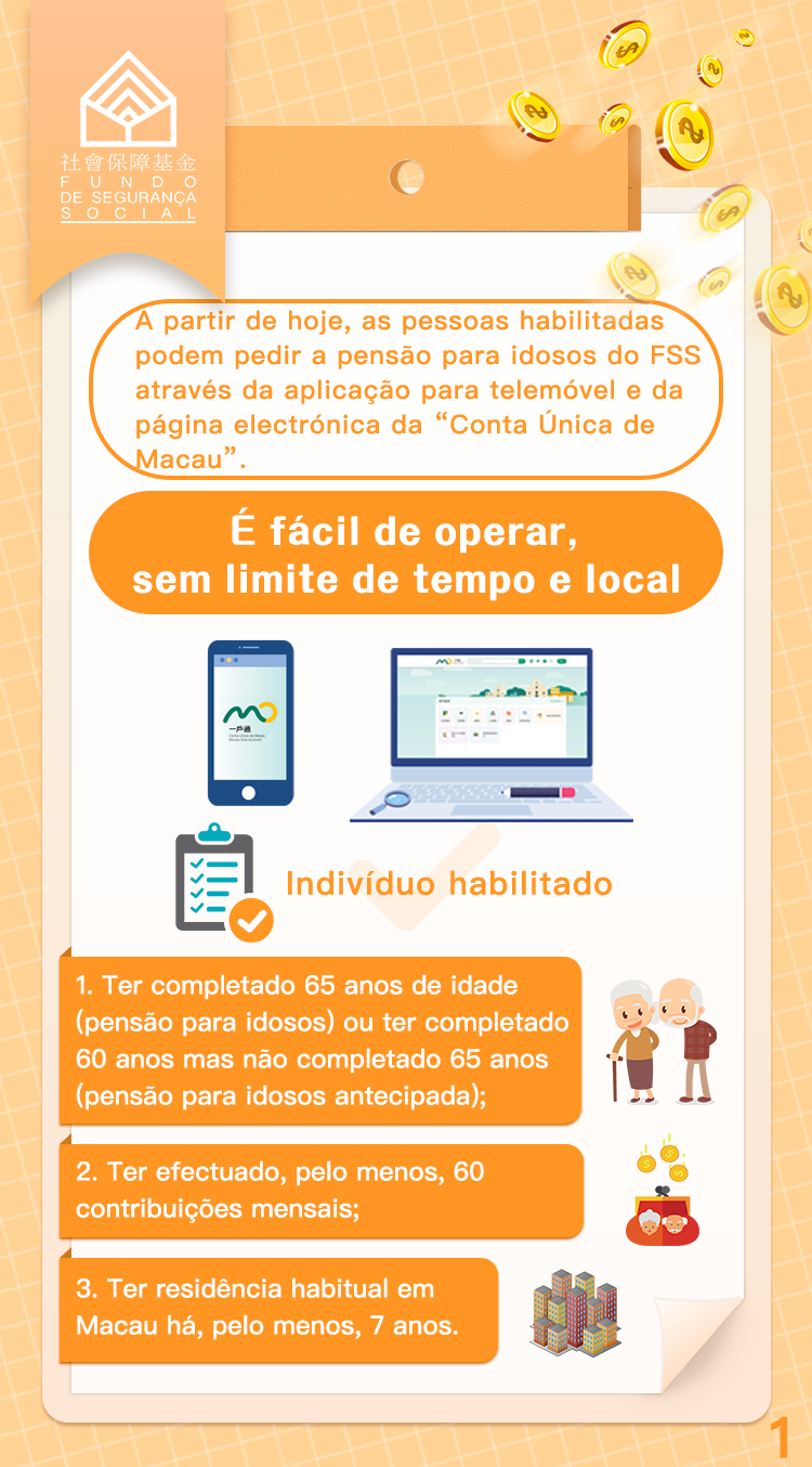 Quer com idade igual ou superior a 65 anos, ou com idade igual ou superior a 60 anos mas inferior a 65 anos, quer a inscrição no regime da segurança social feita antes de 1 de Janeiro de 2011 (antigo regime) ou depois de 1 de Janeiro de 2011 (novo regime), os beneficiários, desde que tenham efectuado, pelo menos, sessenta contribuições mensais e tenham residência habitual na RAEM há, pelo menos, sete anos, podem requer a pensão para idosos na aplicação para telemóvel ou na página electrónica “Conta Única de Macau”, sem sair de casa.