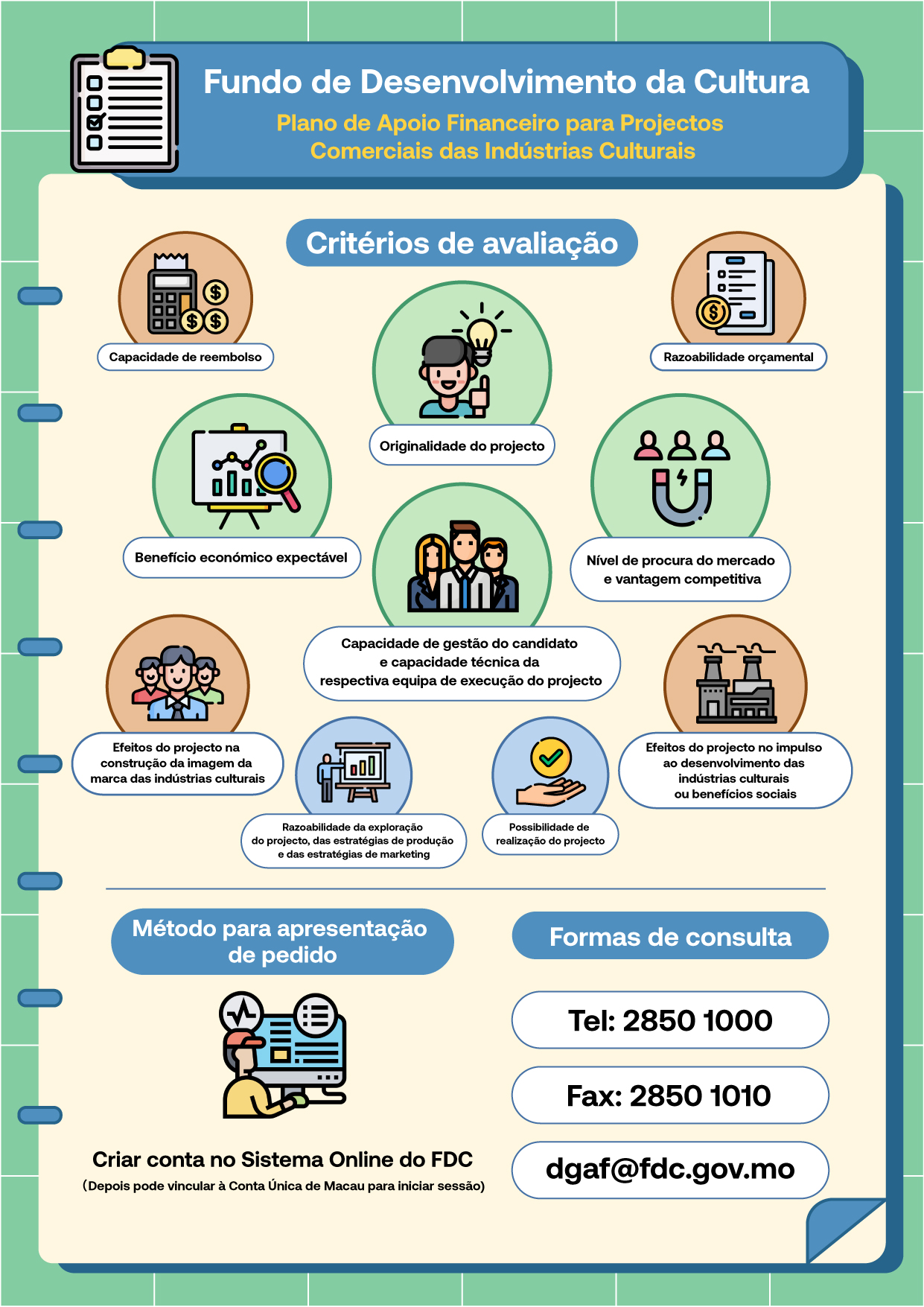 O candidato deve ser empresa comercial, constituída legalmente na RAEM, com mais de 50% do seu capital social detido por residentes da RAEM, ou ser empresário comercial, pessoa singular. Há 4 modalidades de apoio financeiro: empréstimos sem juros, pagamento de juros de empréstimos bancários, subsídio e empréstimos sem juros, pagamento de juros de empréstimos bancários e empréstimos sem juros. As empresas só podem optar por uma das modalidades para o pedido. Caso a empresa esteja no prazo de apoio financeiro, concedido na modalidade de subsídio pelo FDC (antigo Fundo das Indústrias Culturais), e não tenha apresentado o relatório final, ou caso tenha sido financiado sob a modalidade de subsídio por três vezes, só pode pedir a concessão por empréstimos sem juros ou pagamento de juros de empréstimos bancários. No entanto, não será contado o número de concessão no âmbito dos outros planos de apoio financeiro.