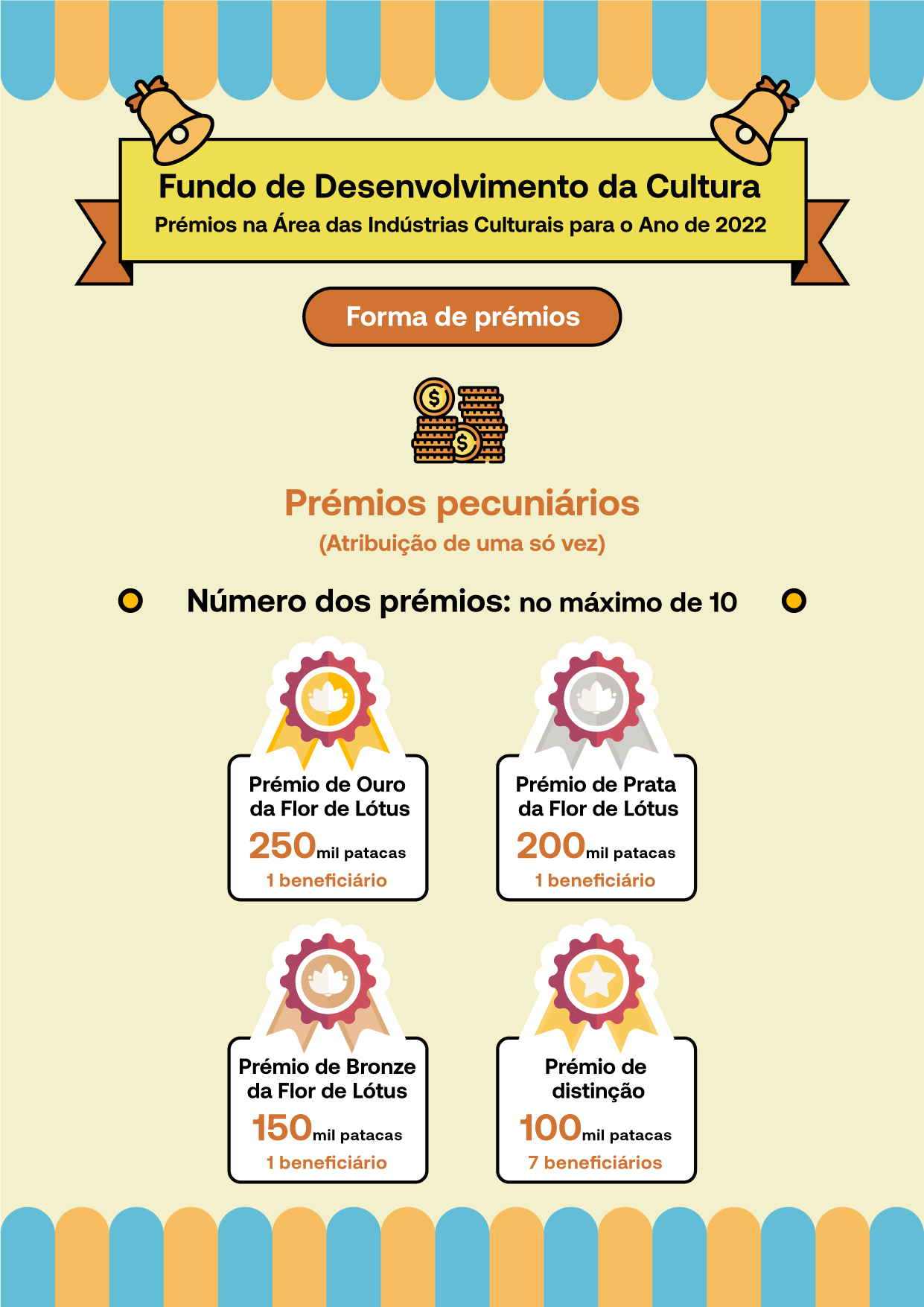 O máximo dos prémios é de 10, dos quais, serão atribuídas respectivamente 1 medalha de ouro, prata e bronze do Prémio da Flor de Lótus, com os prémios pecuniários, por ordem, de MOP 250 mil, MOP 200 mil e MOP 150 mil, sendo o número dos prémios de distinção de 7 e o prémio pecuniário de MOP 100 mil será concedido a cada premiado.