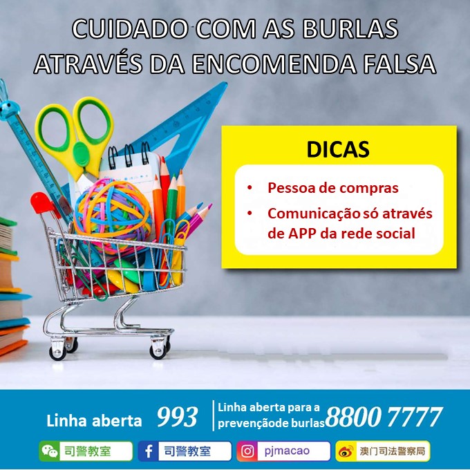 Recentemente, a Polícia Judiciária recebeu dois casos de burla do tipo de encomenda de mercadorias. Num caso, alguém fingiu ser funcionário de um instituto do ensino superior e telefonou para a vítima e fez um pedido de comida a fornecer por takeaway. Depois de ter efectuado o pagamento da encomenda ele voltou a contactar a vítima através de aplicação de comunicação de telemóvel, e indicou-lhe um “fornecedor” designado para se fazer a encomenda de um prato chinês “Tentação de Buda ou Fotiaoqiang”. A seguir, foi enviada para a vítima uma foto contendo um registo de transferência bancária para mostrar que o pagamento havia sido feito antecipadamente. A vítima acreditou e pagou um sinal ao “fornecedor” designado, mas mais tarde, descobriu que não havia recebido o dinheiro transferido. Dado que perdeu até o contacto com ele, deduziu ter sido burlado.