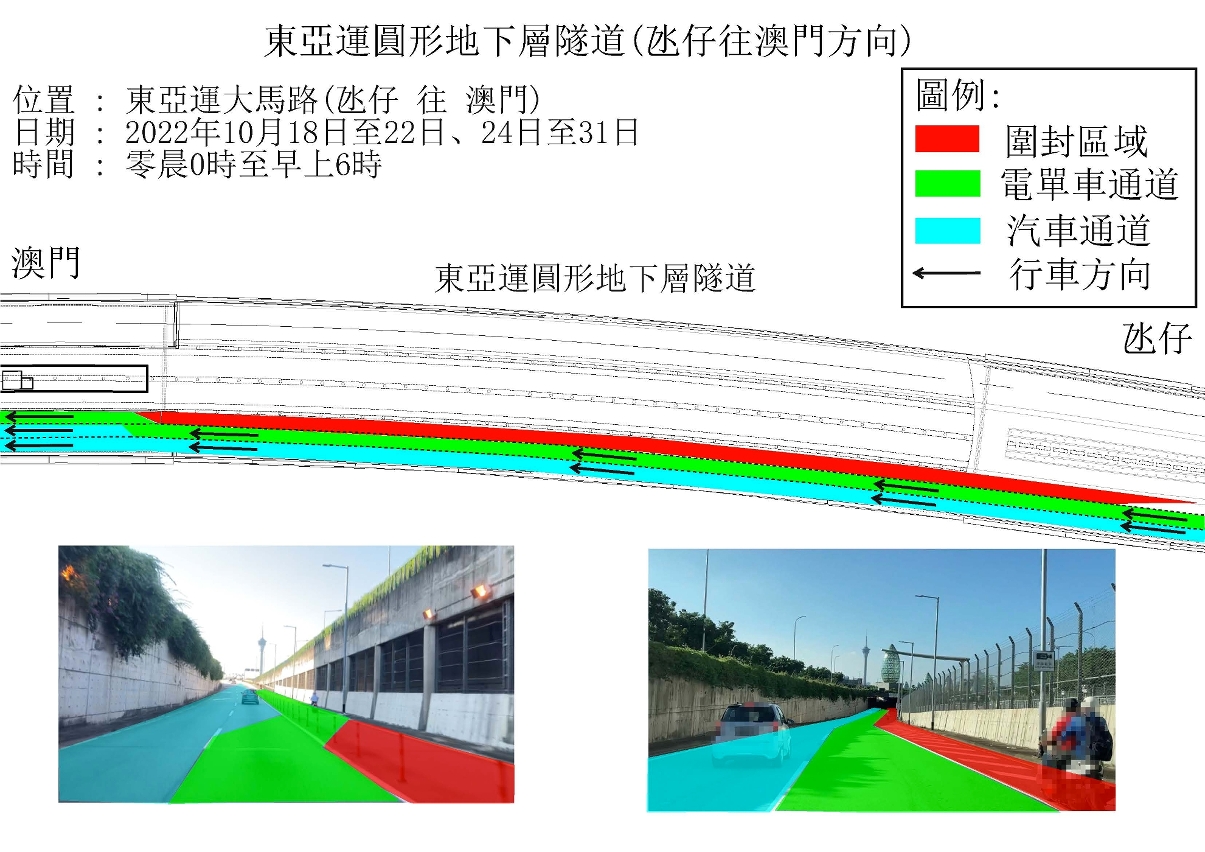 - Durante o período entre 10 de Outubro e 17 de Outubro (das 10h00 às 16h00): Será executada a obra no tabuleiro inferior da Rotunda dos Jogos da Ásia Oriental em direcção de Macau à Taipa, vedada a via de trânsito do lado direito e implementado o condicionamento ao trânsito. (Os detalhes encontram-se na figura 1)