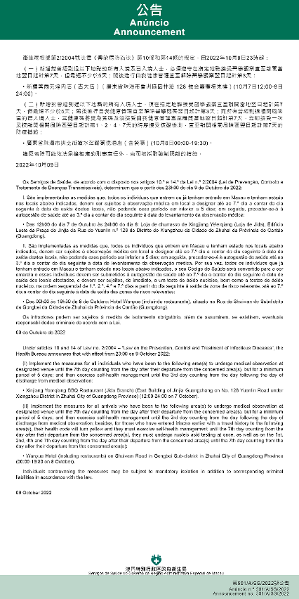 Tendo em consideração a evolução epidemiológica mais actualizada no Interior da China, os Serviços de Saúde, de acordo com o disposto nos artigos 10.º e 14.º da Lei n.º 2/2004 (Lei de Prevenção, Controlo e Tratamento de Doenças Transmissíveis), determinam que a partir das 23h00 do dia 9 de Outubro de 2022, são implementadas as medidas antiepidémicas para quem tenha estado em diversas áreas da Cidade de Zhuhai da Província de Cantão (Guangdong):