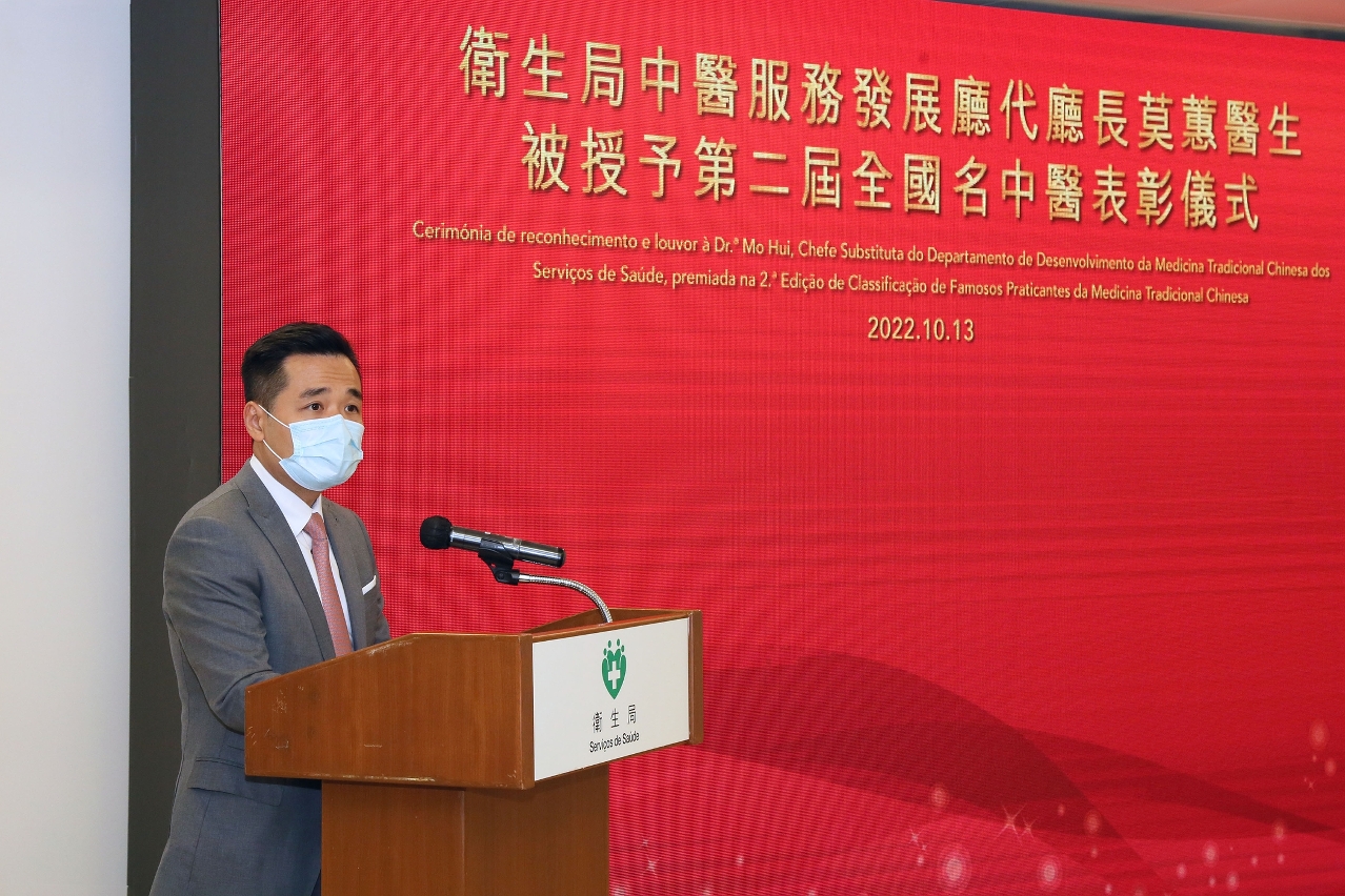 Durante a cerimónia, o Director do Departamento, Dr. Wan Sucheng leu a decisão de que à Chefe substituta do Departamento, Dr.ª Mo Hui lhe foi atribuído pela Comissão Nacional de Saúde e pela Administração Estatal de Medicina Tradicional Chinesa o título de “Médica de Nacionalmente Famosa ” na 2ª edição, salientando que, é primeira vez que uma médica de MTC de Macau recebe esse título, para além de ser uma honra pessoal, também é um reconhecimento do Governo Central quanto ao trabalho de desenvolvimento da medicina tradicional chinesa (adiante designadamente por MTC) do Governo da RAEM. A criação do Departamento de Desenvolvimento dos Serviços de Medicina Tradicional Chinesa pelos Serviços de Saúde demonstra a importância dada à MTC, particularmente, o papel positivo da MTC desempenhado durante o combate à epidemia. O Gabinete de Ligação do Governo Popular Central na Região Administrativa Especial de Macau continuará a apoiar os trabalhos de MTC em Macau, a promover o intercâmbio de MTC, a generalizar a cultura de MTC e a impulsionar em conjunto o desenvolvimento da MTC.