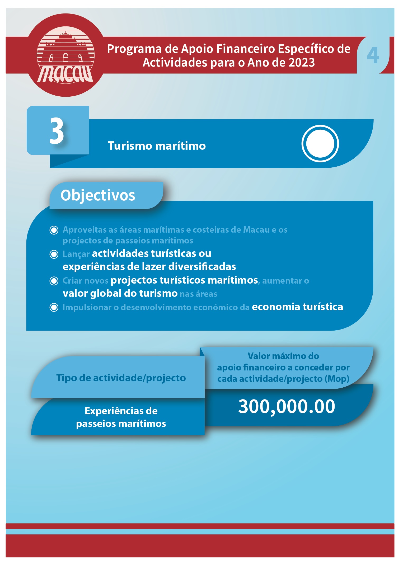 Programa Específico de Apoio Financeiro para “Turismo marítimo”: aproveitar as áreas marítimas e costeiras de Macau e os projectos de passeios marítimos, lançar actividades turísticas ou experiências de lazer diversificadas sob o tema marítimo, criando novos projectos turísticos marítimos e aumentando o valor global do turismo nas áreas costeiras e marítimas.