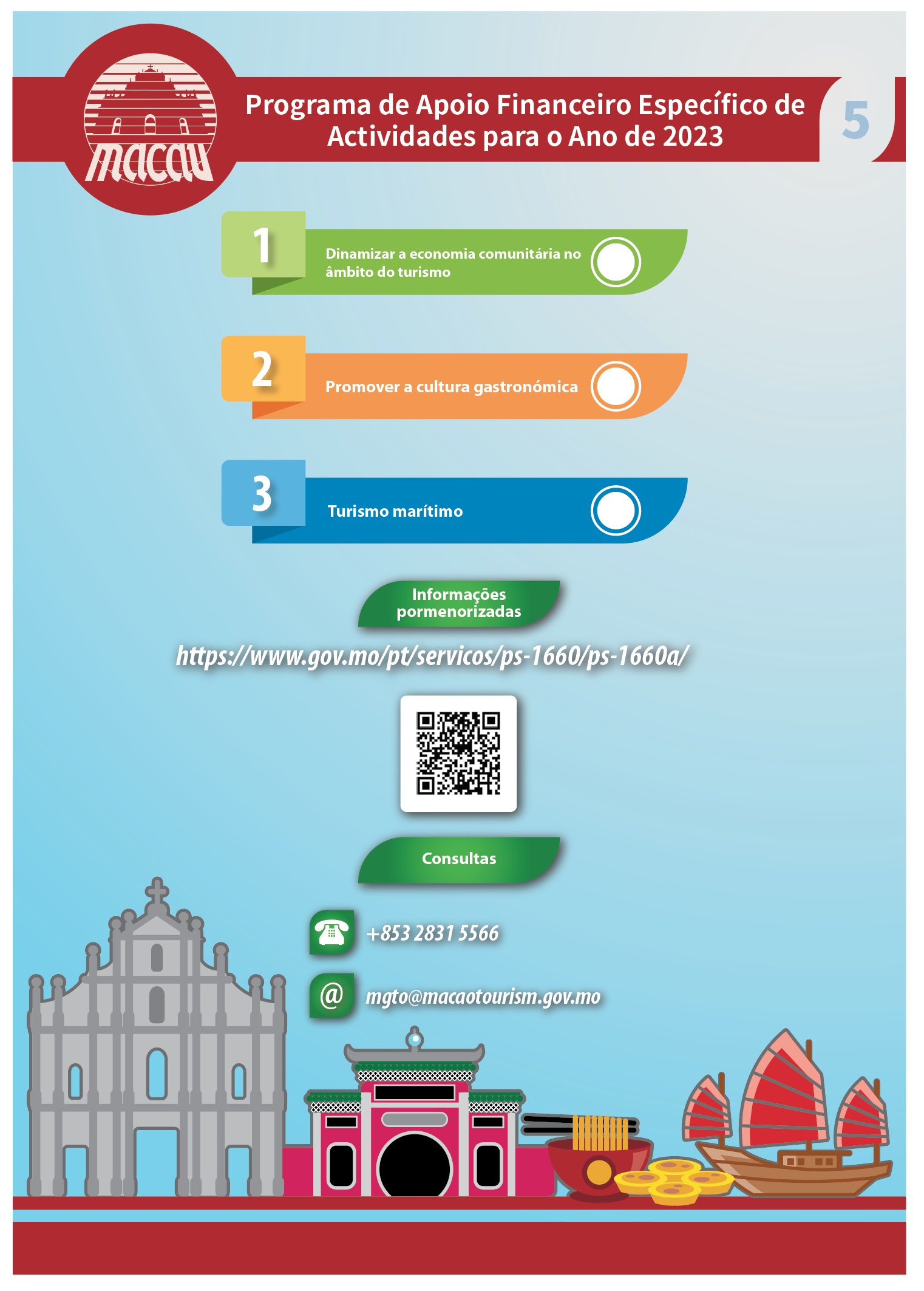 Programa Específico de Apoio Financeiro para “Dinamizar a economia comunitária no âmbito do turismo”: aproveitar a cultura, a história e os recursos turísticos dos bairros comunitários, bem como complementar os eventos turísticos emblemáticos de Macau, para explorar elementos turísticos das comunidades e, através da participação activa das micro, pequenas e médias empresas, revitalizar o ambiente de negócios, atraindo visitantes para os diversos bairros comunitários.