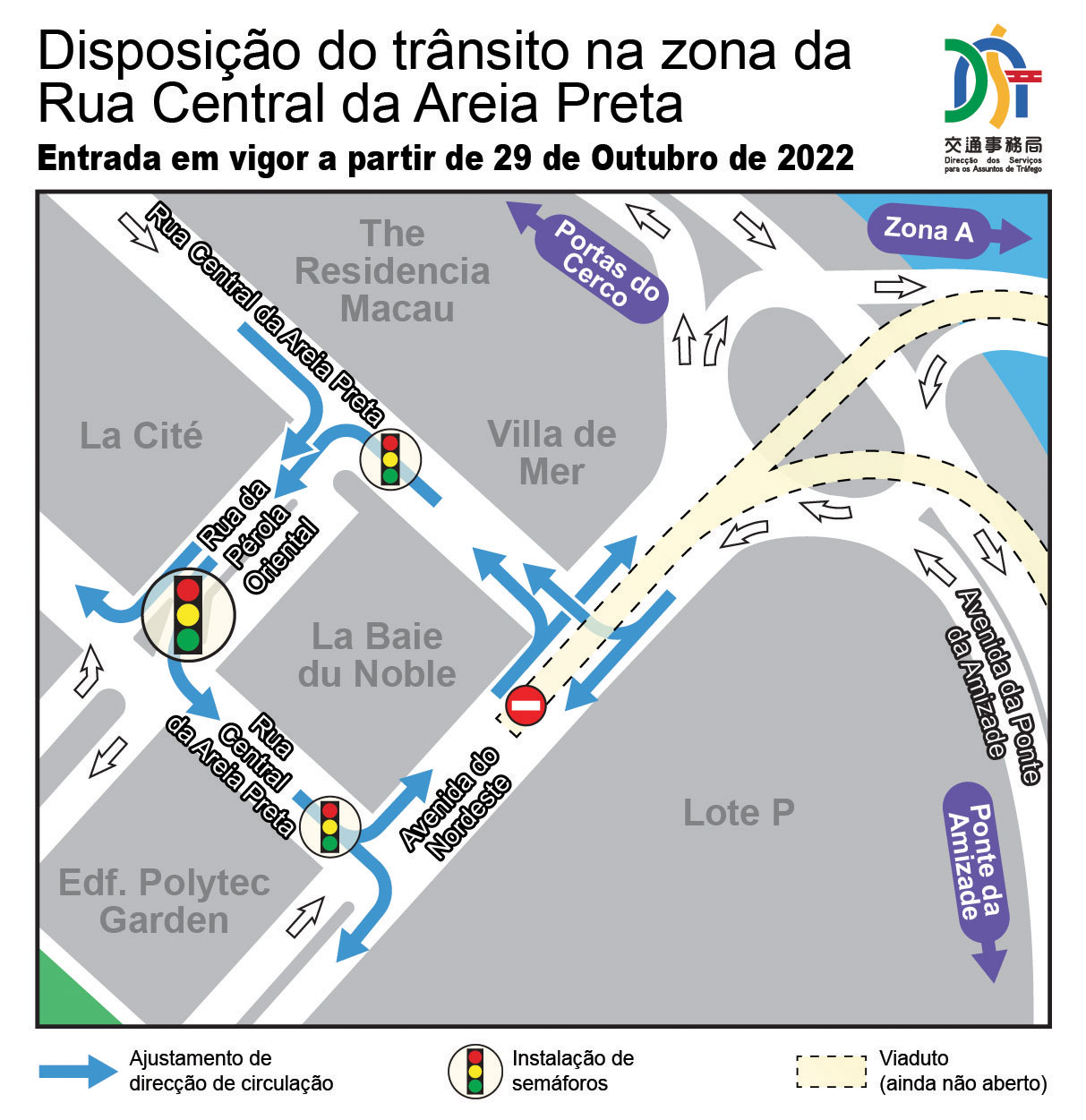 À medida que estarão concluídas as obras de reordenamento do trânsito na zona da Rua Central da Areia Preta, e em conjugação com a abertura em breve do viaduto da Rotunda da Amizade, a partir de 29 (sábado) de Outubro, será ajustada definitivamente a direcção de circulação na Rua da Pérola Oriental, bem como nos dois troços da Rua Central da Areia Preta situados entre a Rua da Pérola Oriental e a Avenida do Nordeste; os novos semáforos instalados em três intersecções da Rua Central da Areia Preta e da Rua da Pérola Oriental entrarão simultaneamente em funcionamento (vide diagrama). Os sinais marcados no pavimento, sinais verticais e sinalização luminosa nos respectivos troços serão ajustados no mesmo dia (29) de manhã, acompanhados com o apoio dos agentes de trânsito para manter a ordem de circulação.