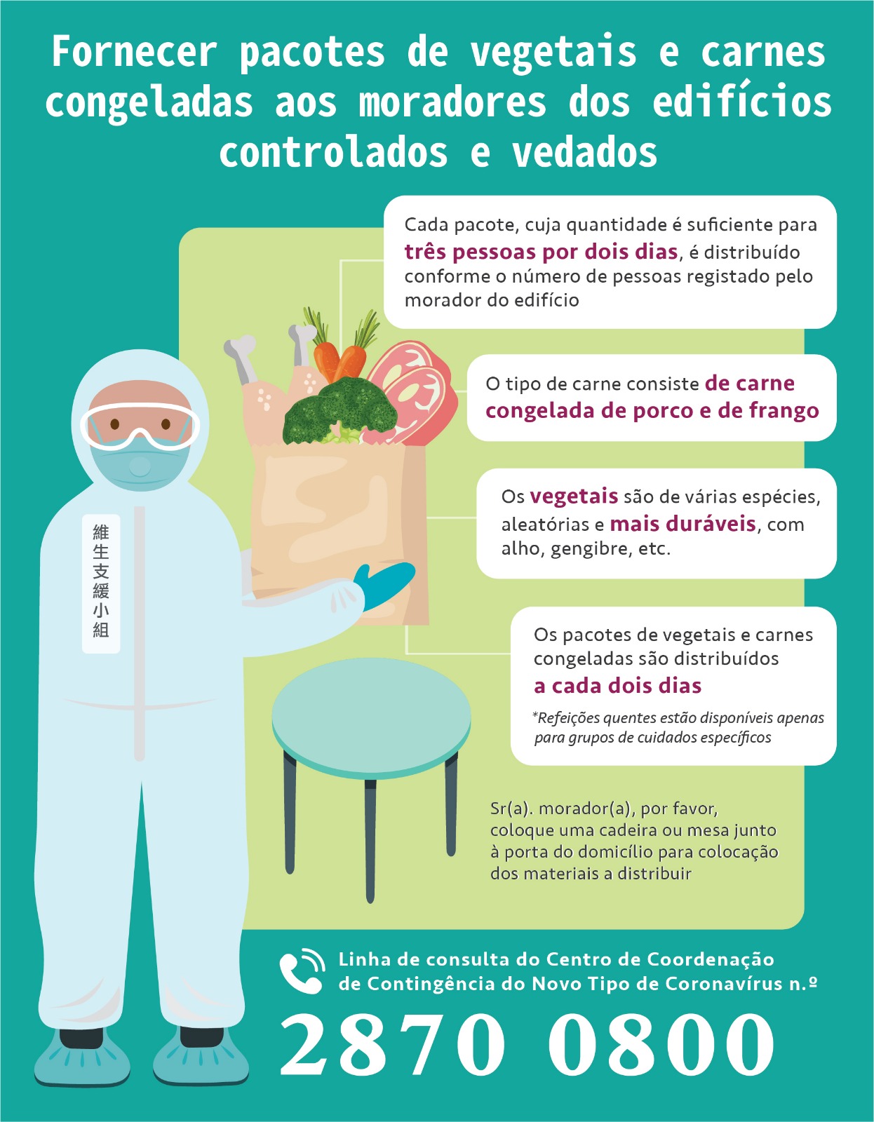 O Instituto para os Assuntos Municipais (IAM), o Corpo de Polícia de Segurança Pública (CPSP) e o Instituto de Acção Social (IAS) constituíram o Grupo de Apoio à Subsistência, o qual iniciou os trabalhos de averiguação aos moradores-alvo do edifício da Zona de Código de Saúde de Cor Vermelha para inteirar-se da quantidade real de moradores e das suas necessidades básicas, de forma a fornecer os artigos de subsistência. Ao mesmo tempo, tem-se empenhado em apoiar os Serviços de Saúde (SSM) a realizar, de forma ordenada, os trabalhos de amostragem de ácido nucleico viral a todos os moradores, divididos em grupo, no edifício vedado.