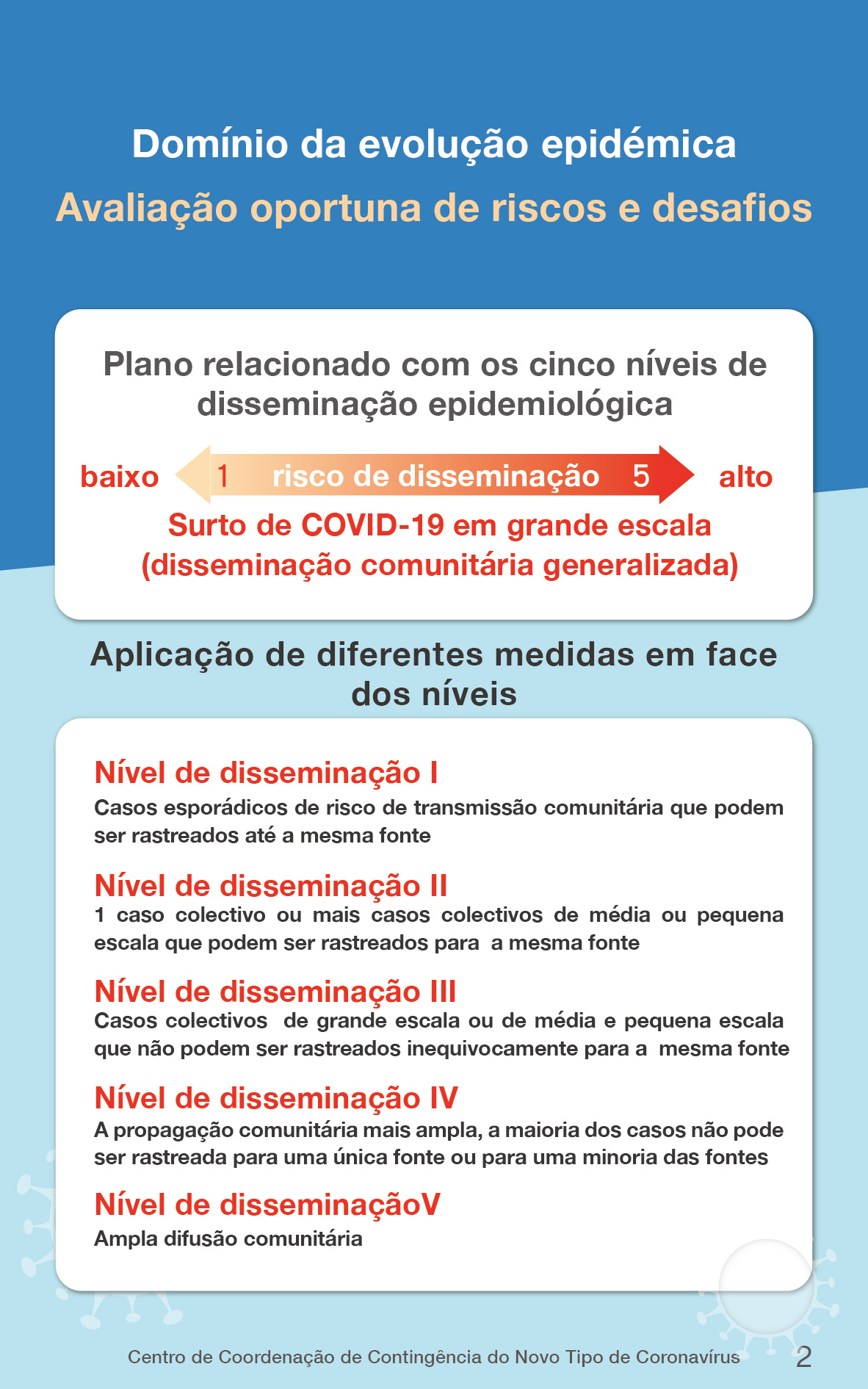No “Plano de contingência, 2.ª versão”, no total foram revistos os 9 itens, incluindo: ajustar as medidas de prevenção e controlo de epidemia normalizada, ajustar as medidas de resposta de cinco níveis de transmissão, melhorar as instalações de isolamento centralizado, reforçar a supervisão de observação médica do hotel, melhorar completamente a capacidade de teste de ácido nucleico, melhorar o programa de teste do ácido nucleico para toda a população, evitar a propagação do vírus na comunidade, actualizar o quadro das medidas de controlo comunitário e optimizar as quatro plataformas de consulta.