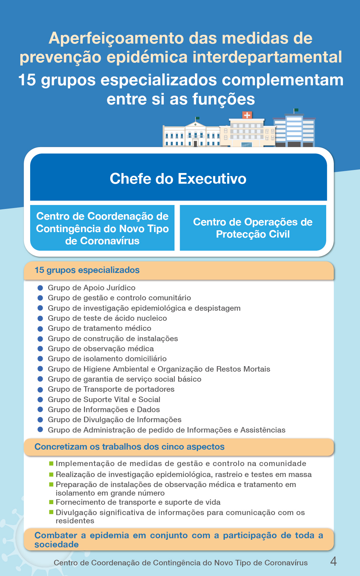 O Relatório faz um balanço dos trabalhos e experiências de combate à epidemia em 4 fases à epidemia ocorrida “no dia 18 de Junho”. O conteúdo total destes 13 itens incluí: Alerta e vigilância contínua da epidemia, colaboração de 15 grupos especializados de trabalho, aumento da capacidade de teste do ácido nucleico através da utilização dos veículos itinerantes de colheita de amostras e Postos de Teste de Ácido Nucleico ao ar livre, prevenção da propagação do vírus na comunidade com teste rápido de antigénio e distribuição de máscaras KN95, promoção da aplicação móvel do “Código de Saúde de Macau” com função de registo de itinerários para reforçar a capacidade de investigação e rastreamento epidemiológico, criação de 88 zonas de código vermelho e 301 zonas de código amarelo para implementar a prevenção e controlo baseado em zonas e níveis, ajustamento dinâmico de controlo comunitário como aplicação de medidas “em estado relativamente estático” permitindo o período necessário para sair de casa, de modo a garantir a vida básica dos residentes, encarrego de uma instituição médica terceirizada para inspeccionar regularmente o controlo de infecção nos hotéis de observação médica para efeitos de reforço da supervisão, uso de hotéis de tratamento em isolamento aberto e instalações de isolamento para convalescentes para garantir as instalações adequadas para o tratamento em isolamento, manutenção dos serviços médicos necessários e reserva de medicamentos necessários e implementação da consulta médica à distância conforme necessário, no total cerca de 130.000 casos de consultas e casos de pedido de assistência, ou seja, através quatro plataformas de consulta para reforçar a comunicação de informações com os cidadãos, intensificação do controlo da infecção nos três tipos de estabelecimentos especiais, bem como, prevenção do surto epidémico através do mecanismo da prevenção e controlo em conjunto de Zhuhai-Macau.