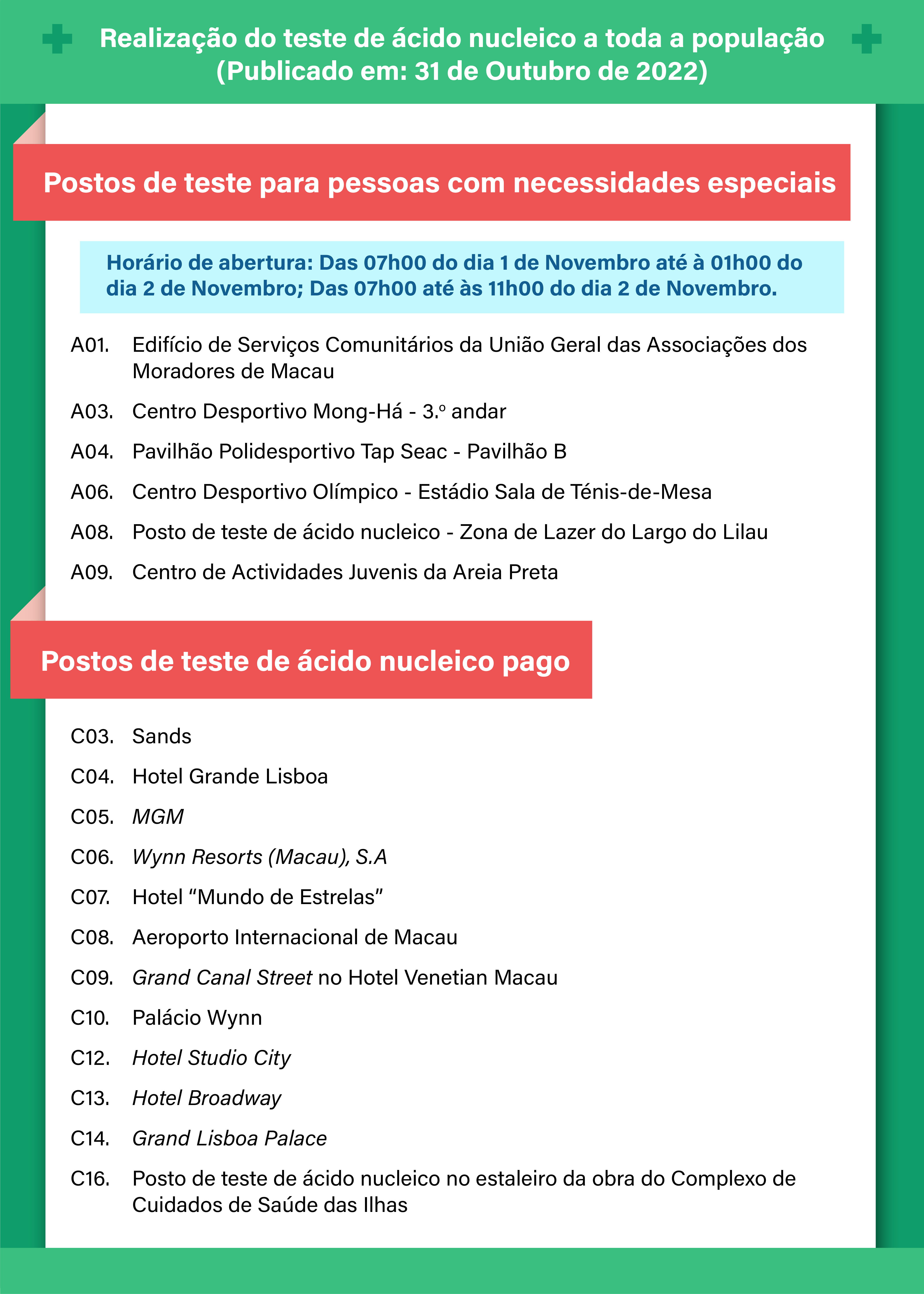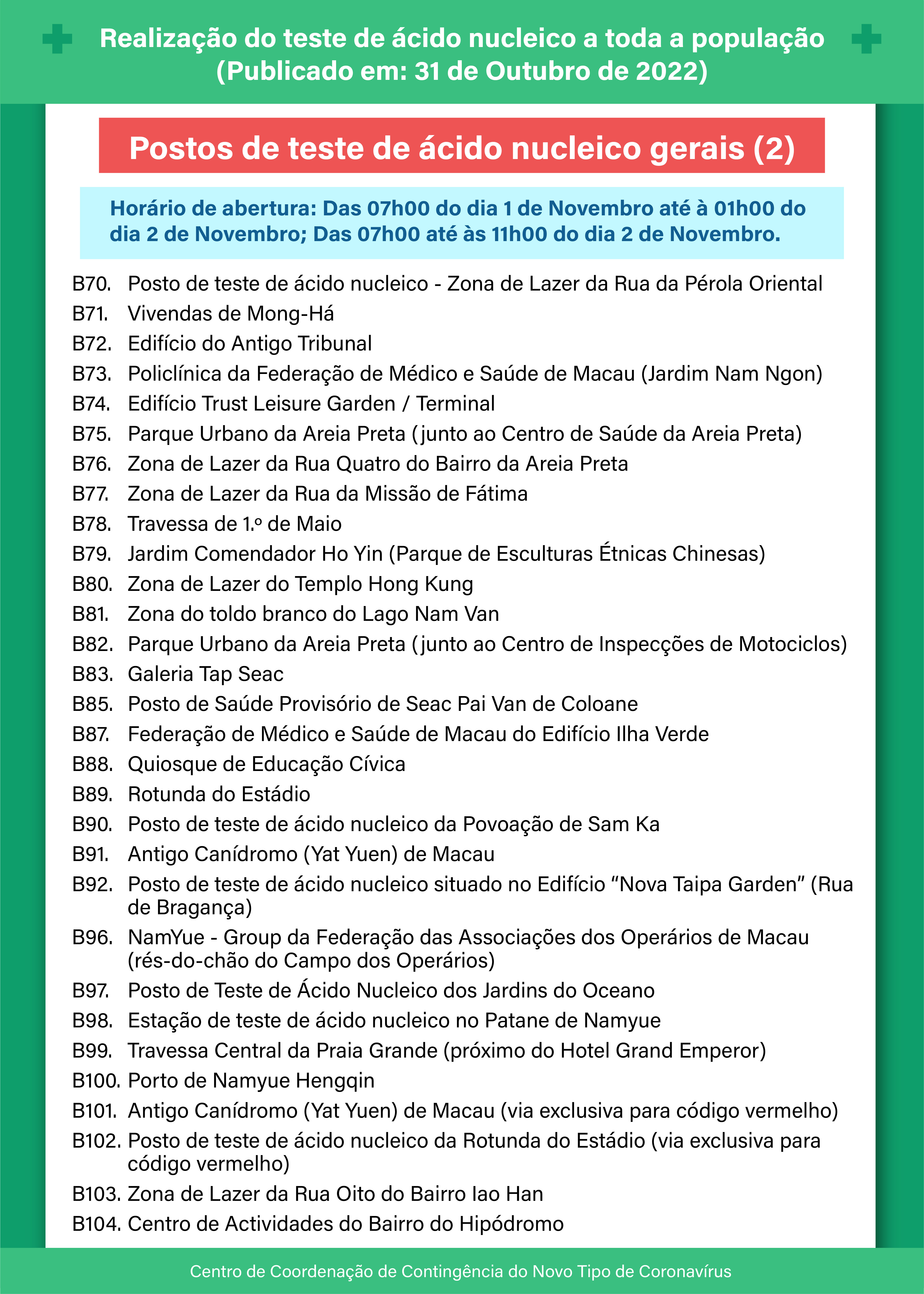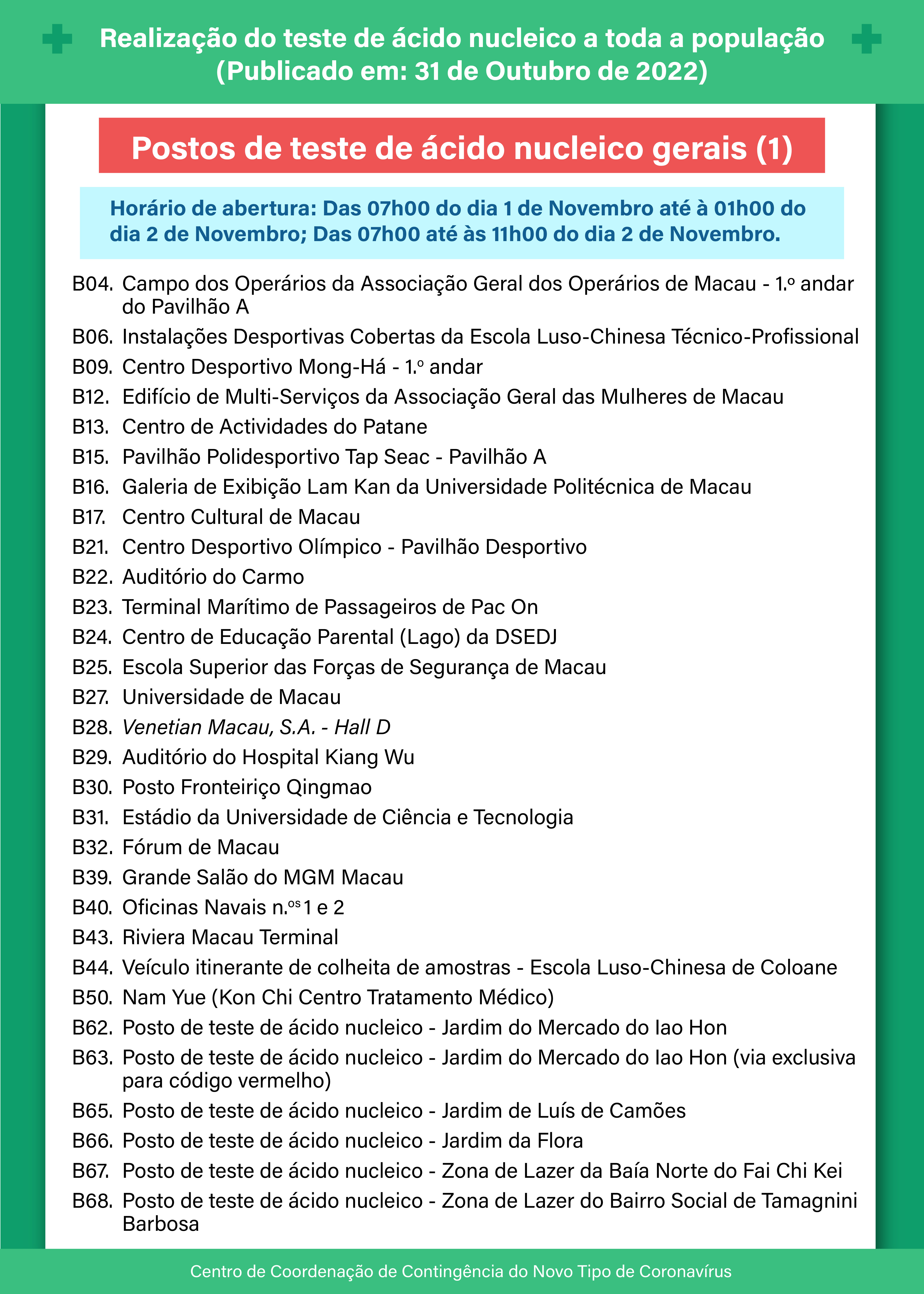 O Centro de Coordenação de Contingência do Novo Tipo de Coronavírus anuncia que o teste massivo de ácido nucleico, será realizado a partir do dia 1 de Novembro (Terça-feira), pelas 07h00 até ao dia 2 de Novembro (Quarta-feira), pelas 11h00.