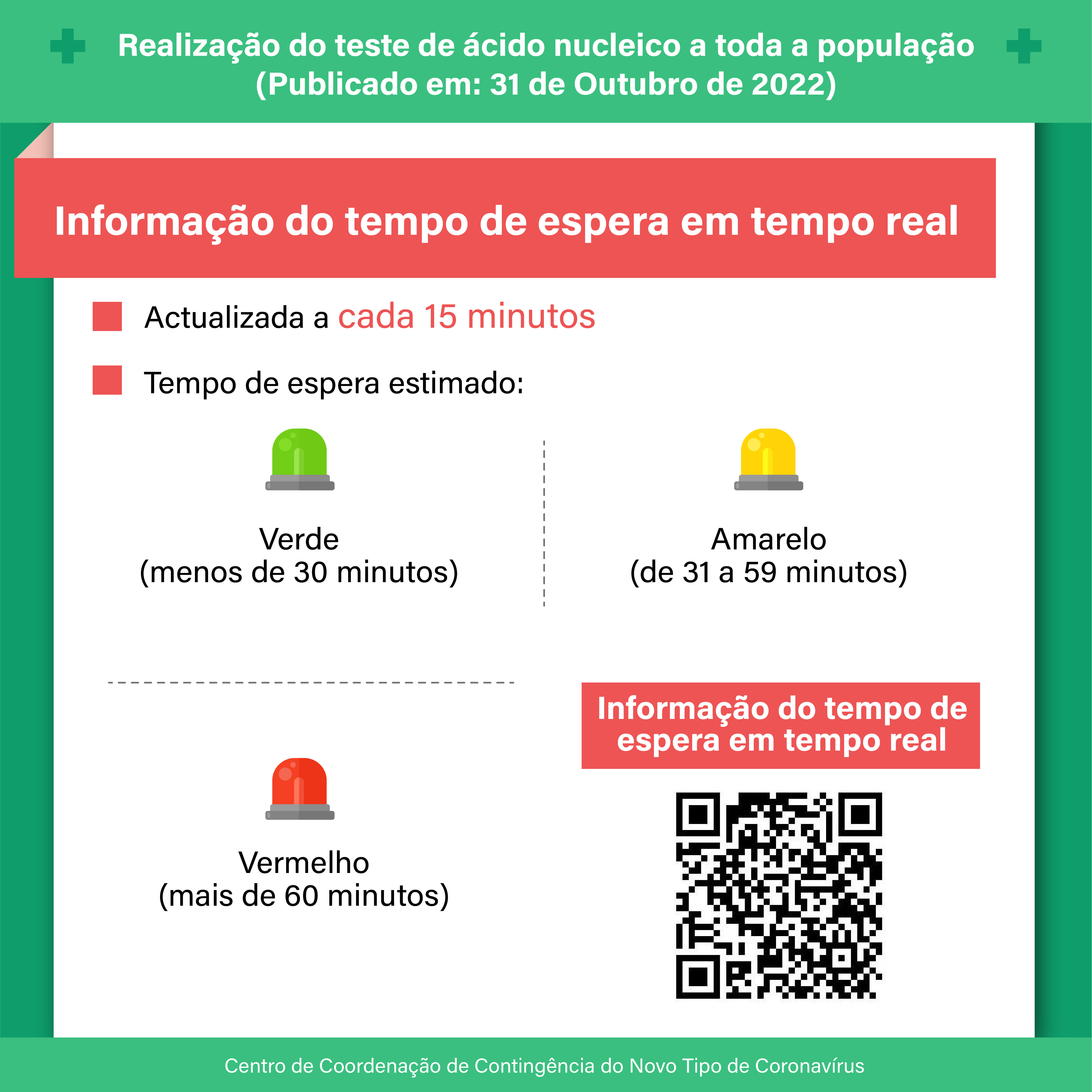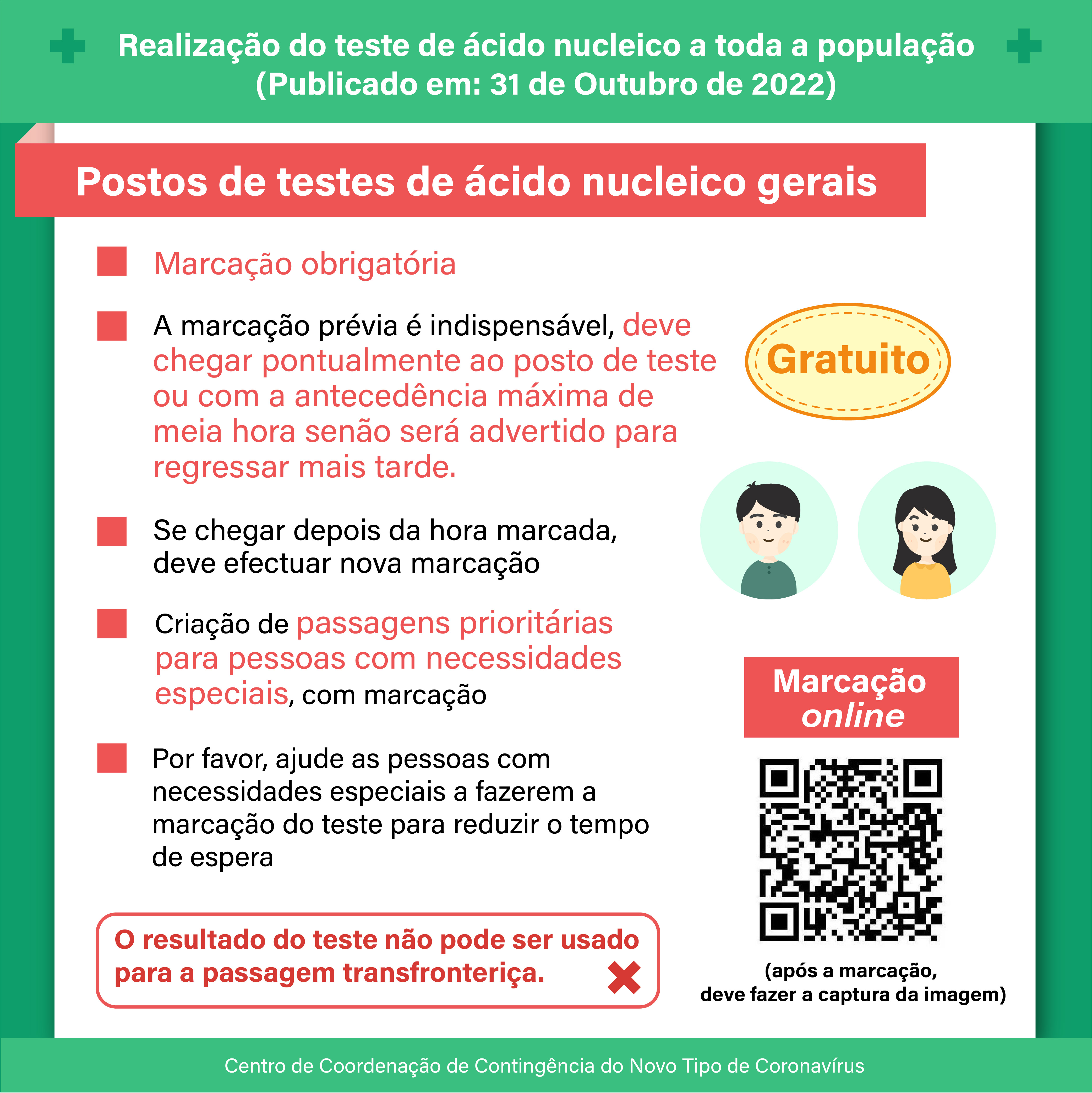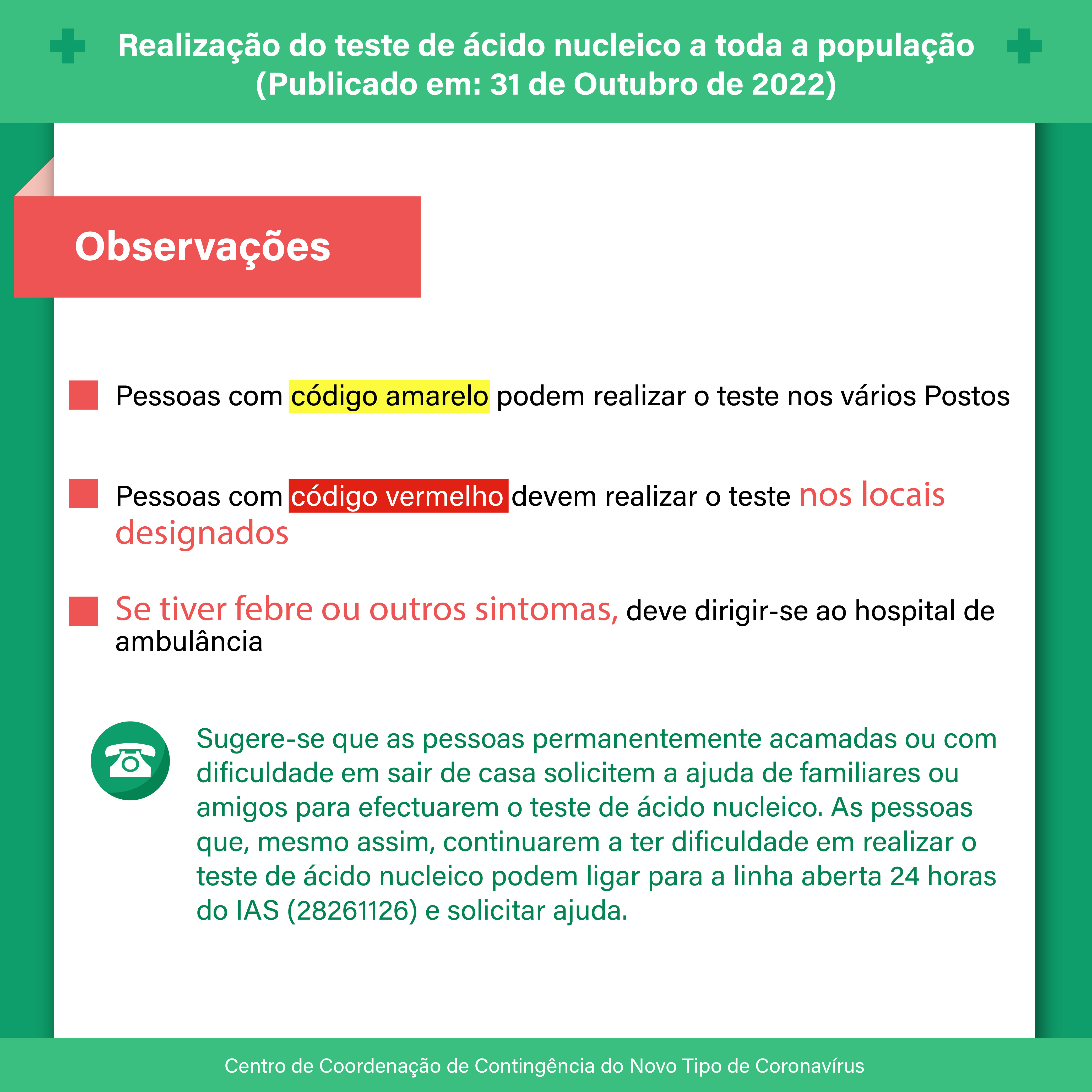 O Centro de Coordenação de Contingência do Novo Tipo de Coronavírus anuncia que o teste massivo de ácido nucleico, será realizado a partir do dia 1 de Novembro (Terça-feira), pelas 07h00 até ao dia 2 de Novembro (Quarta-feira), pelas 11h00.