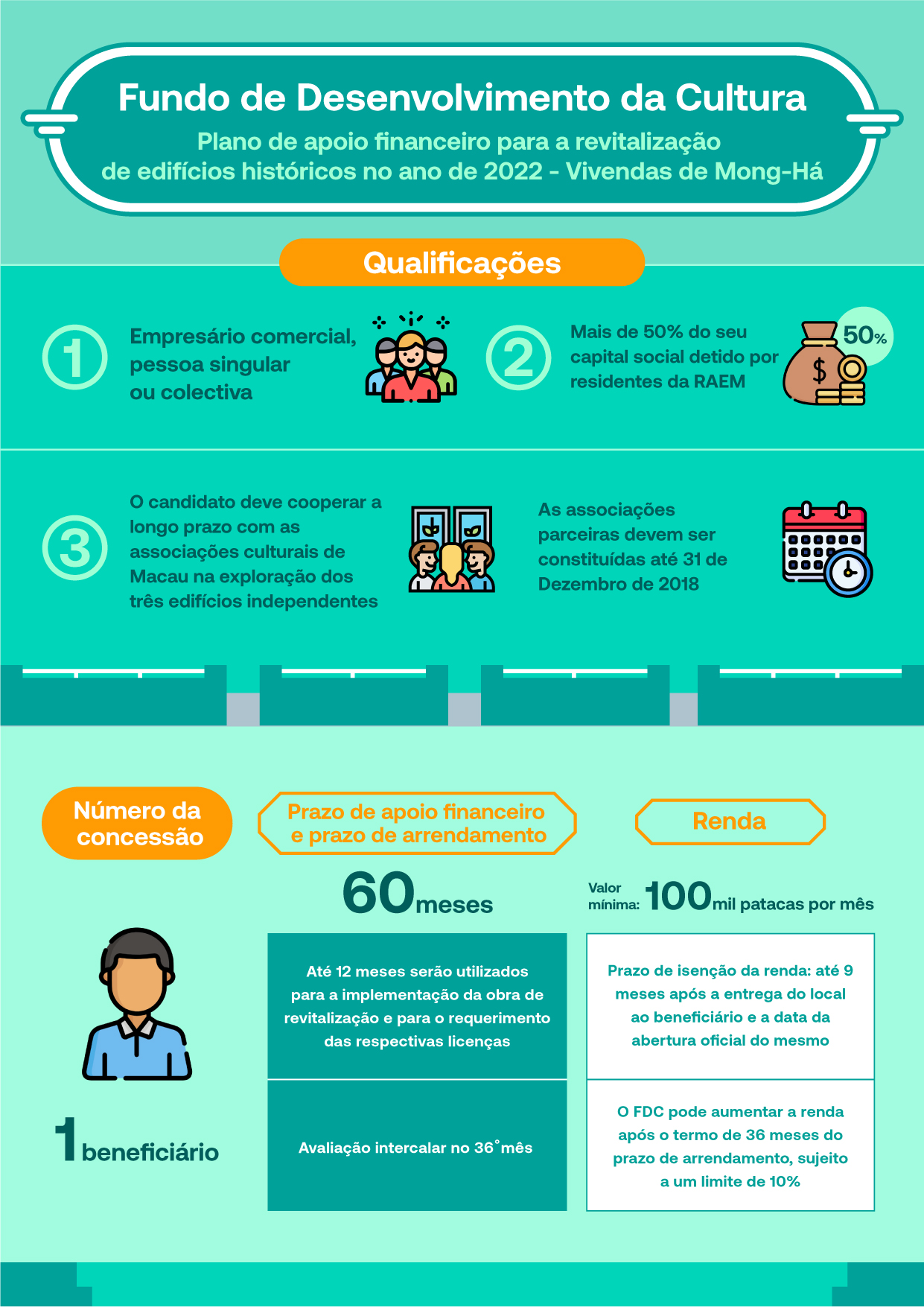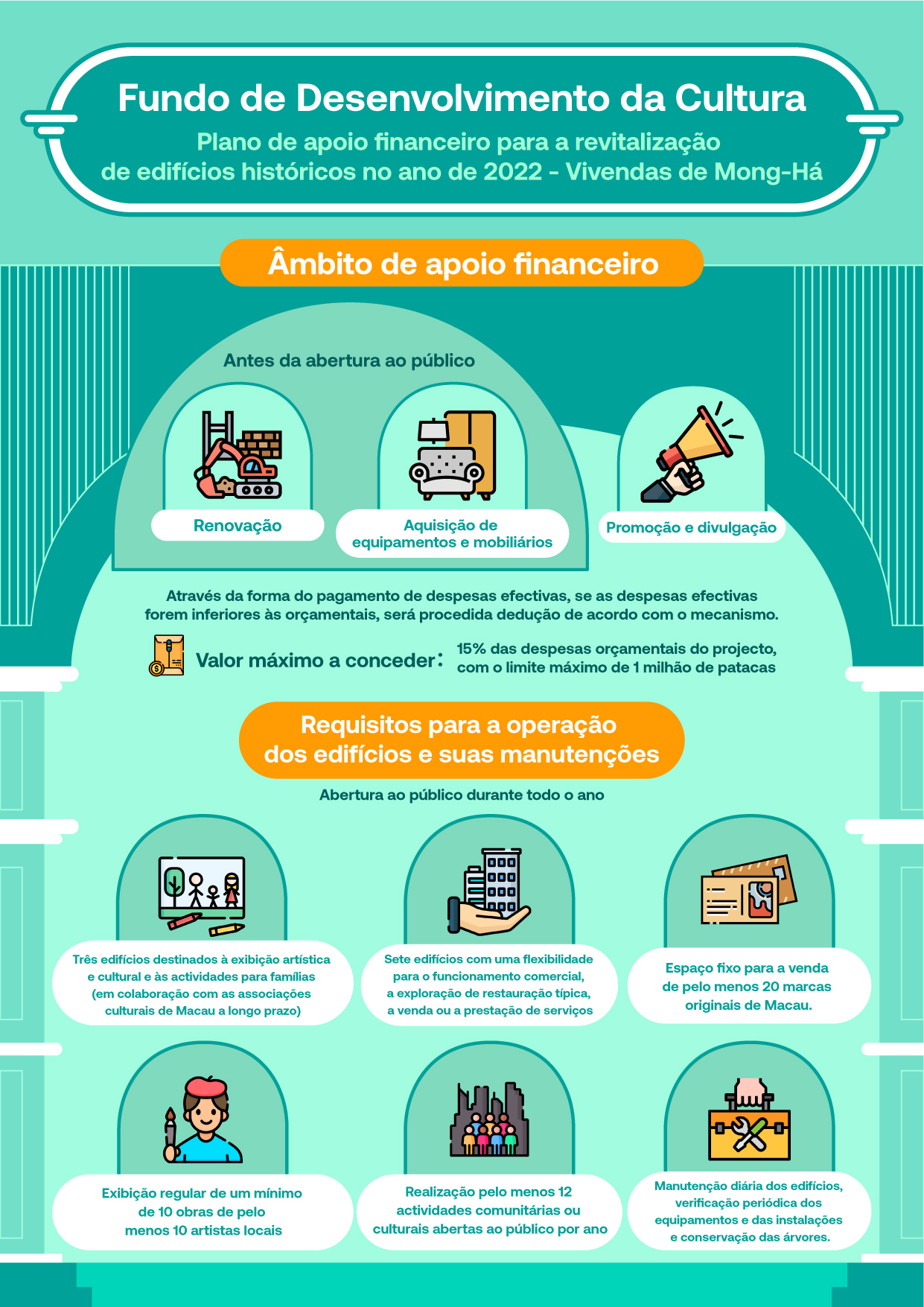 O apoio financeiro é concedido na forma de subsídio, com um montante máximo de 1 milhão de patacas e no total de 1 beneficiário. O prazo de apoio financeiro é de 60 meses, dos quais, até 12 meses serão utilizados para a execução das obras de revitalização e para o pedido das respectivas licenças, sendo efectuada uma avaliação intercalar no 36.º mês. O FDC presta apoio financeiro, na forma de pagamento de despesas efectivas, às despesas da renovação e da aquisição de equipamentos e mobiliário antes da abertura ao público, bem como as despesas da promoção e divulgação durante o prazo de apoio financeiro do projecto. A empresa beneficiária será responsável pelo futuro funcionamento diário do projecto e a sua reparação e manutenção durante o período de utilização. O FDC alugará os edifícios, sendo o valor mínimo da renda mensal de 100 mil patacas, com um prazo máximo de isenção da renda até 9 meses.