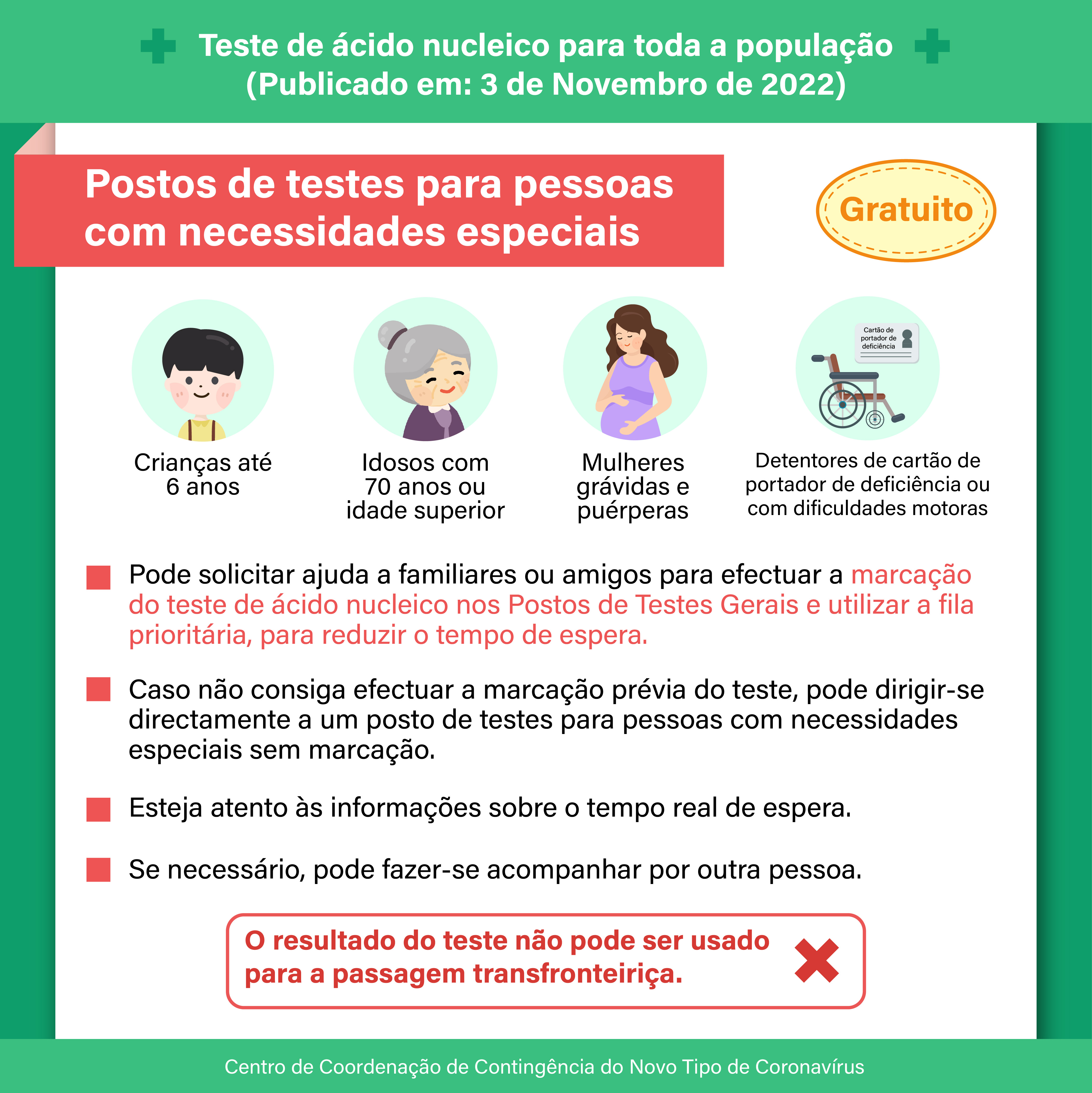 • São criadas filas prioritárias nos postos de testes de ácido nucleico gerais e nos postos de testes de ácido nucleico ao ar livre. Relativamente aos postos de testes destinados as pessoas com necessidades especiais e as filas prioritárias com prioridade, estão abertos para as crianças com idade igual ou inferior a 6 anos, idosos com idade igual ou superior a 70 anos, mulheres grávidas e puérperas, portadores de cartão de registo de avaliação da deficiência, e as pessoas com dificuldade na deslocação. Se for necessário, estas pessoas podem ser acompanhadas por uma pessoa.