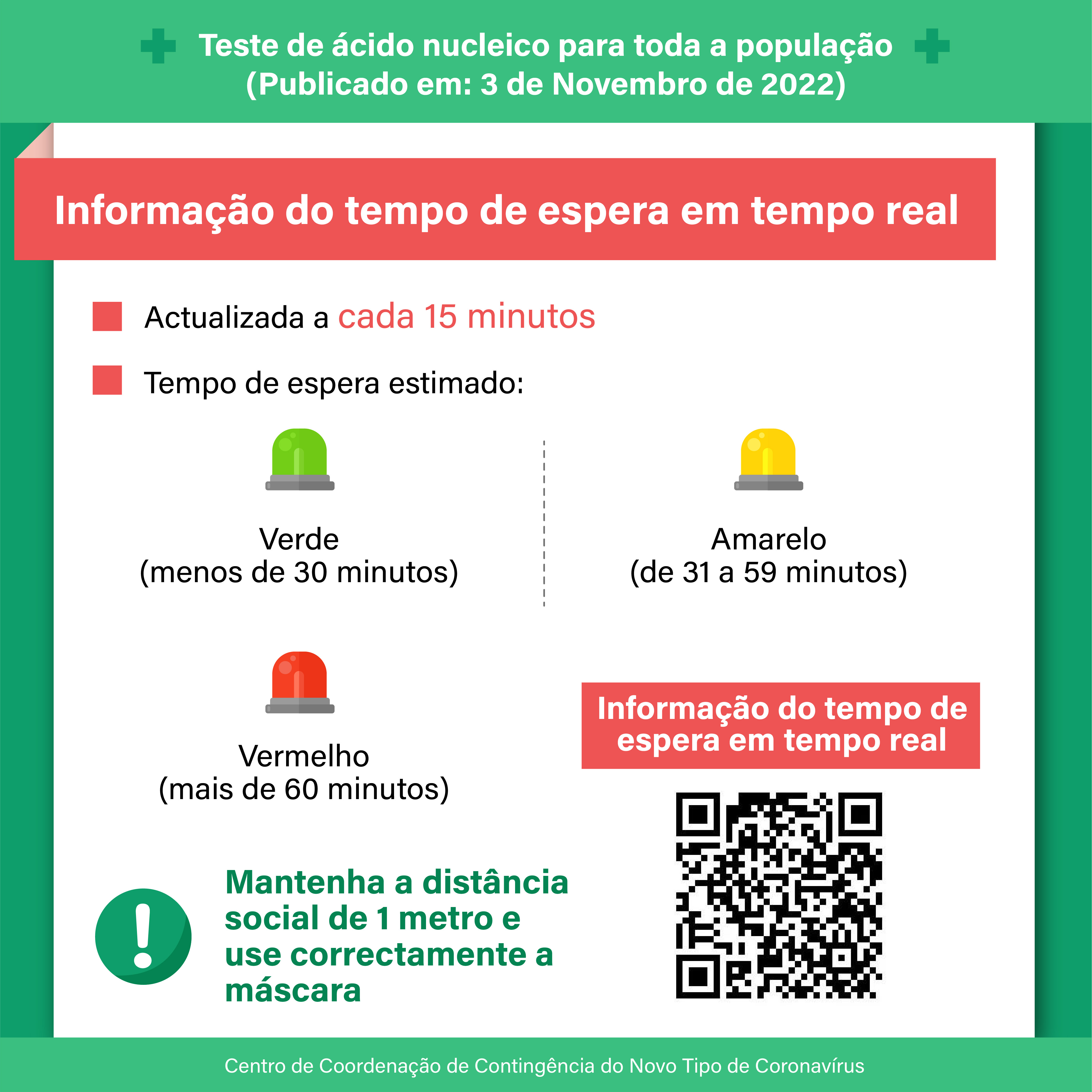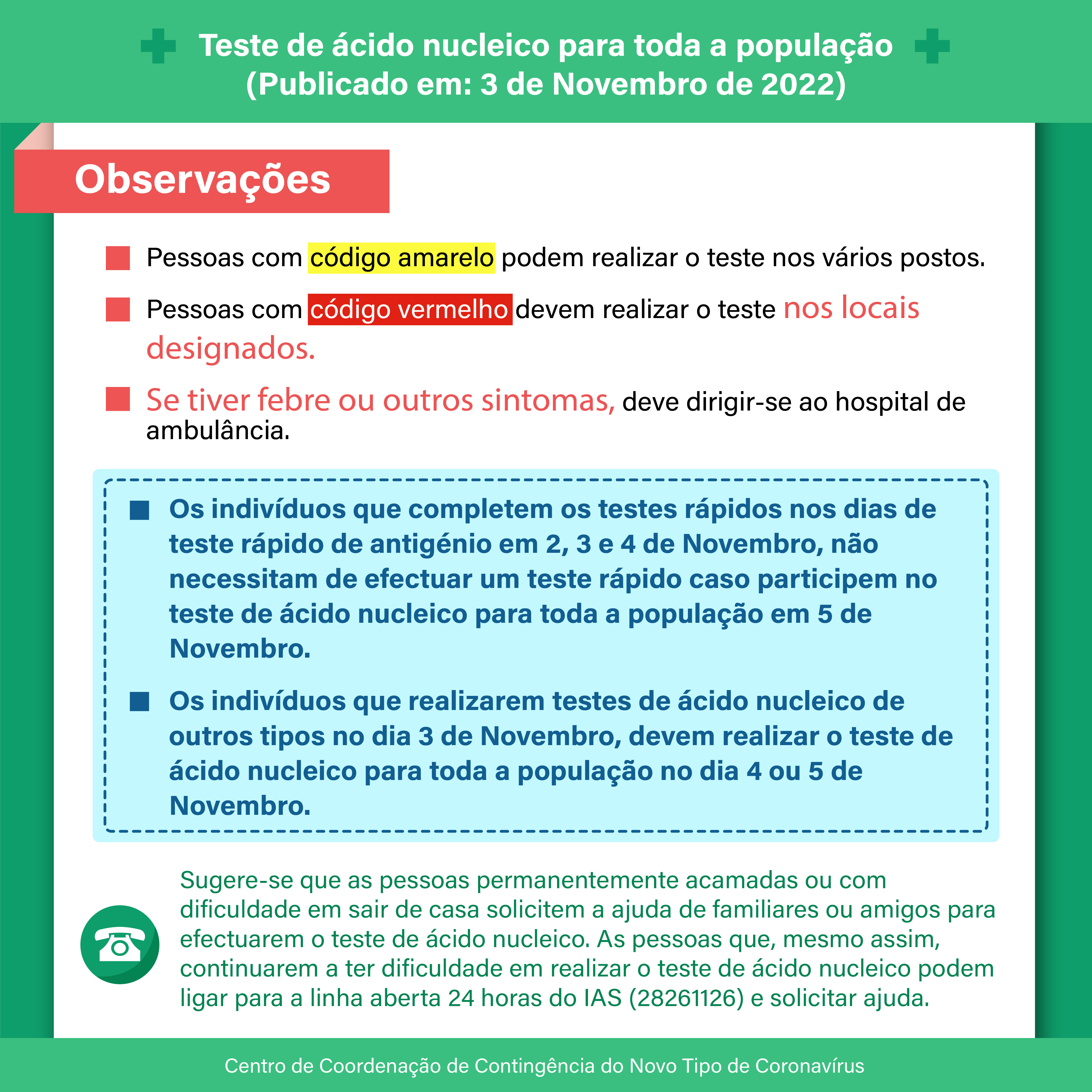 • Caso tenha participado em outros tipos de testes de ácido nucleico, no dia 3 de Novembro, ainda deve participar na 2.ª ronda de teste massivo de ácido nucleico, nos dias 4 ou 5 de Novembro.