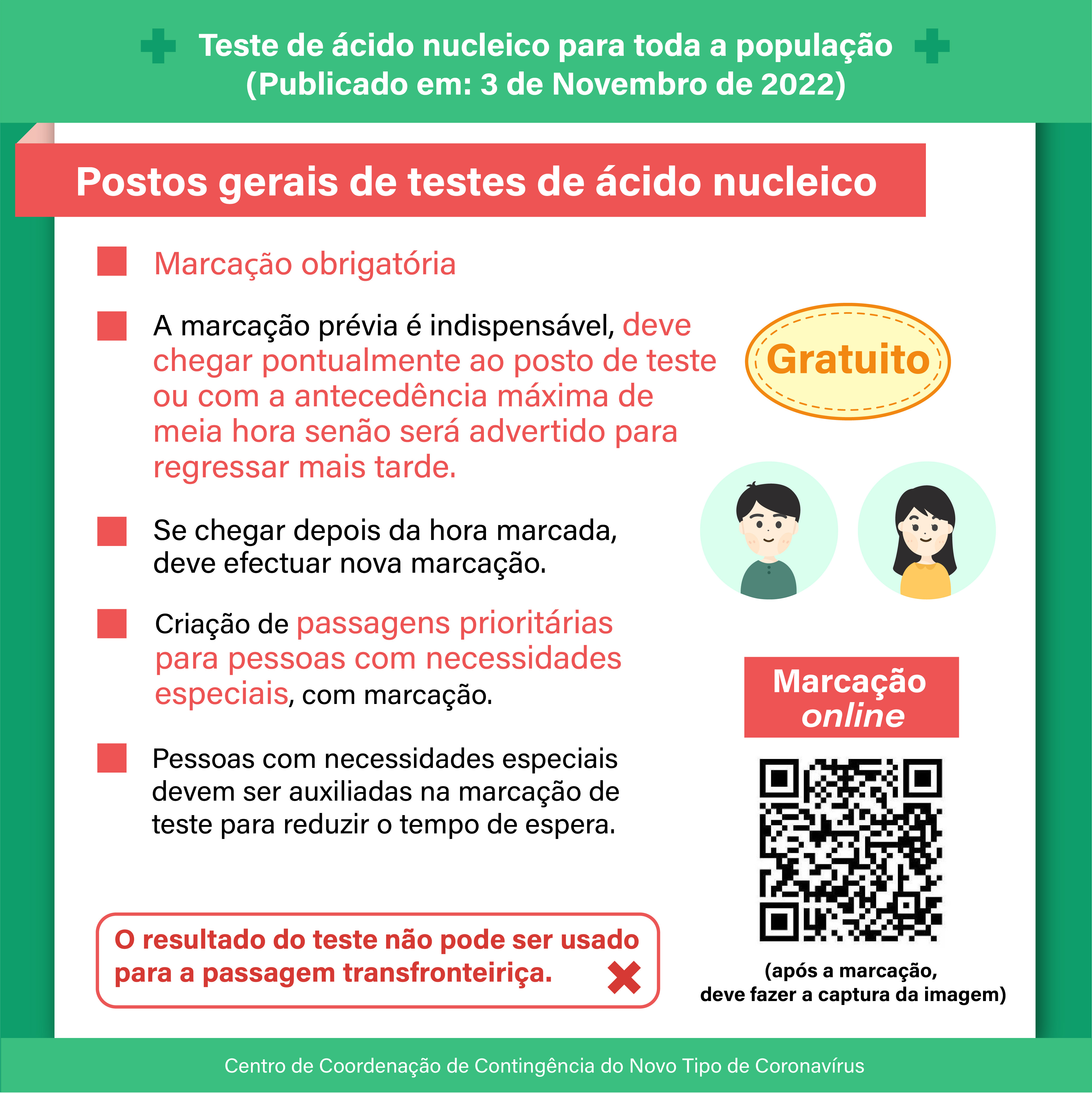 • São instalados postos de testes destinados às pessoas com necessidades especiais (sem marcação prévia), postos de testes gerais (com marcação obrigatória), postos de testes pagos (com marcação obrigatória); Os residentes podem clicar na ligação acima da página principal do sistema de marcação prévia para a realização do teste de ácido nucleico, ou nesta ligação (https://app.ssm.gov.mo/rnastation/map) para consultar onde estão os postos, o seu horário de funcionamento e outras informações.
