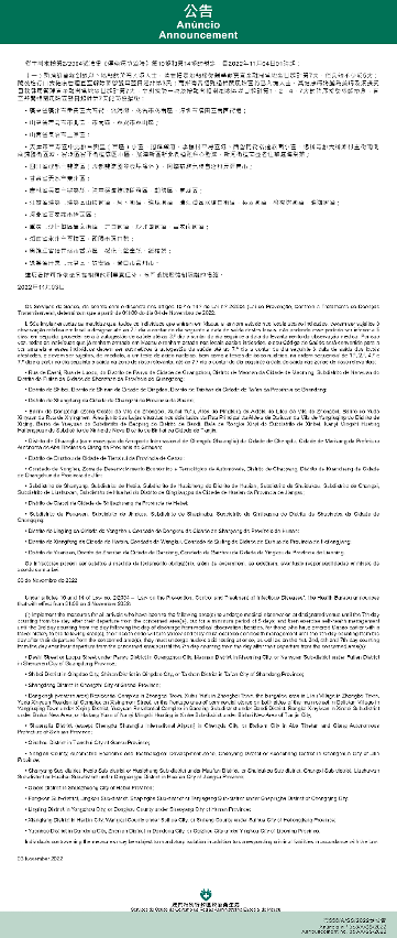 Tendo em consideração a evolução epidemiológica mais actualizada no Interior da China, os Serviços de Saúde, de acordo com o disposto nos artigos 10.º e 14.º da Lei n.º 2/2004 (Lei de Prevenção, Controlo e Tratamento de Doenças Transmissíveis), determinam que a partir da 01h00 do dia 04 de Novembro de 2022, são implementadas ou canceladas as medidas antiepidémicas para quem tenha estado em diversas áreas do Interior da China: