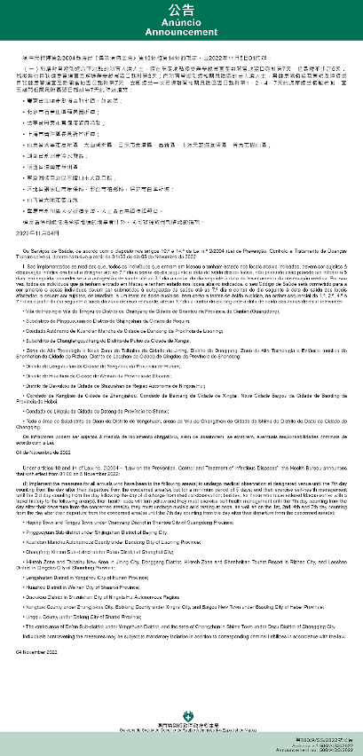 Tendo em consideração a evolução epidemiológica mais actualizada no Interior da China, os Serviços de Saúde, de acordo com o disposto nos artigos 10.º e 14.º da Lei n.º 2/2004 (Lei de Prevenção, Controlo e Tratamento de Doenças Transmissíveis), determinam que a partir da 01h00 do dia 05 de Novembro de 2022, são implementadas ou canceladas as medidas antiepidémicas para quem tenha estado em diversas áreas do Interior da China: