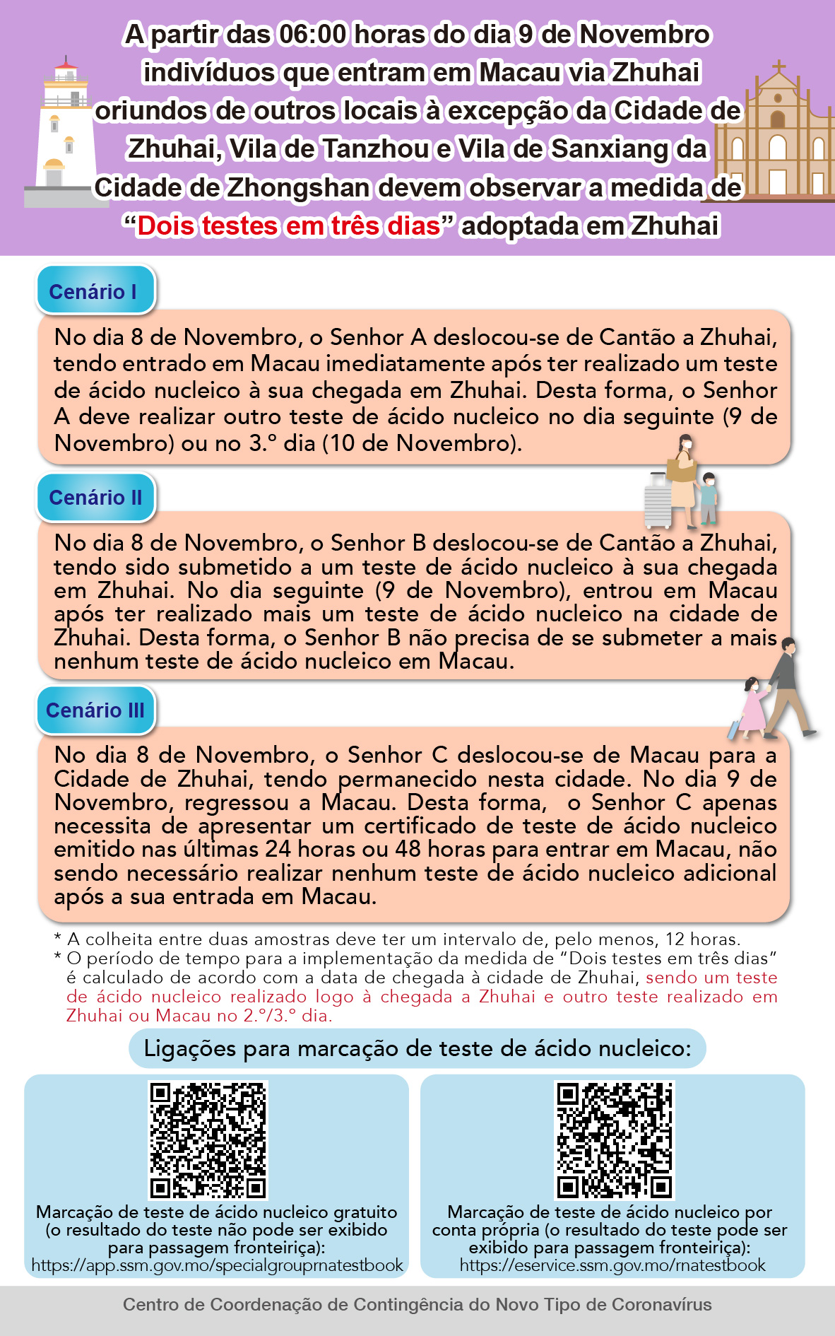 • A partir das 06:00 horas do dia 9 de Novembro indivíduos que entram em Macau via Zhuhai oriundos de outros locais à excepção da Cidade de Zhuhai, Vila de Tanzhou e Vila de Sanxiang da Cidade de Zhongshan devem observar a medida de “Dois testes em três dias” adoptada em Zhuhai
