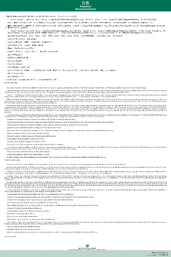 Tendo em consideração a evolução epidemiológica mais actualizada no Interior da China, os Serviços de Saúde, de acordo com o disposto nos artigos 10.º e 14.º da Lei n.º 2/2004 (Lei de Prevenção, Controlo e Tratamento de Doenças Transmissíveis), determinam que a partir da 01h00 do dia 11 de Novembro de 2022, são implementadas ou canceladas as medidas antiepidémicas para quem tenha estado em diversas áreas do Interior da China: