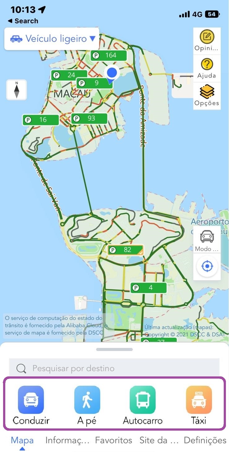 Os utilizadores, ao clicarem as coordenadas no mapa fazendo o zoom, poderão obter as informações sobre os transportes públicos envolventes (paragens dos autocarros, praças dos táxis e estações do metro ligeiro) e os parques de estacionamento público (disponibilidade dos lugares para veículos electrícos e auto-silos com o pagamento electrónico sem contacto). Podem ainda, conforme as suas próprias necessidades, escolher os diferentes meios ou itinerários sugeridos de deslocação. Para os utentes que utilizam o modo de condução, podem ser orientados pela transmissão sonora das informações para saber a disponibilidade dos lugares de estacionamento nos auto-silos circundantes e parquímetros, de modo a prever o tempo e a distância de deslocação.