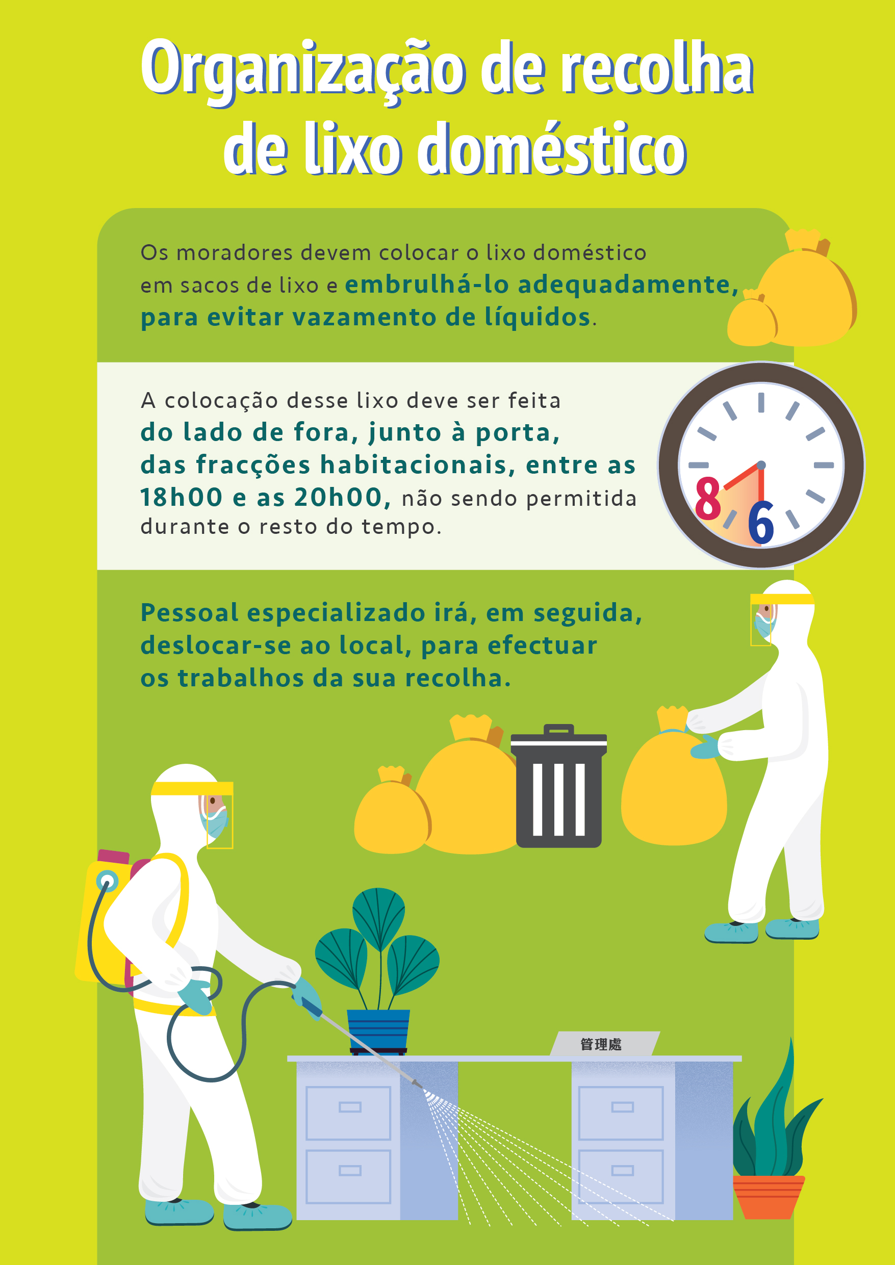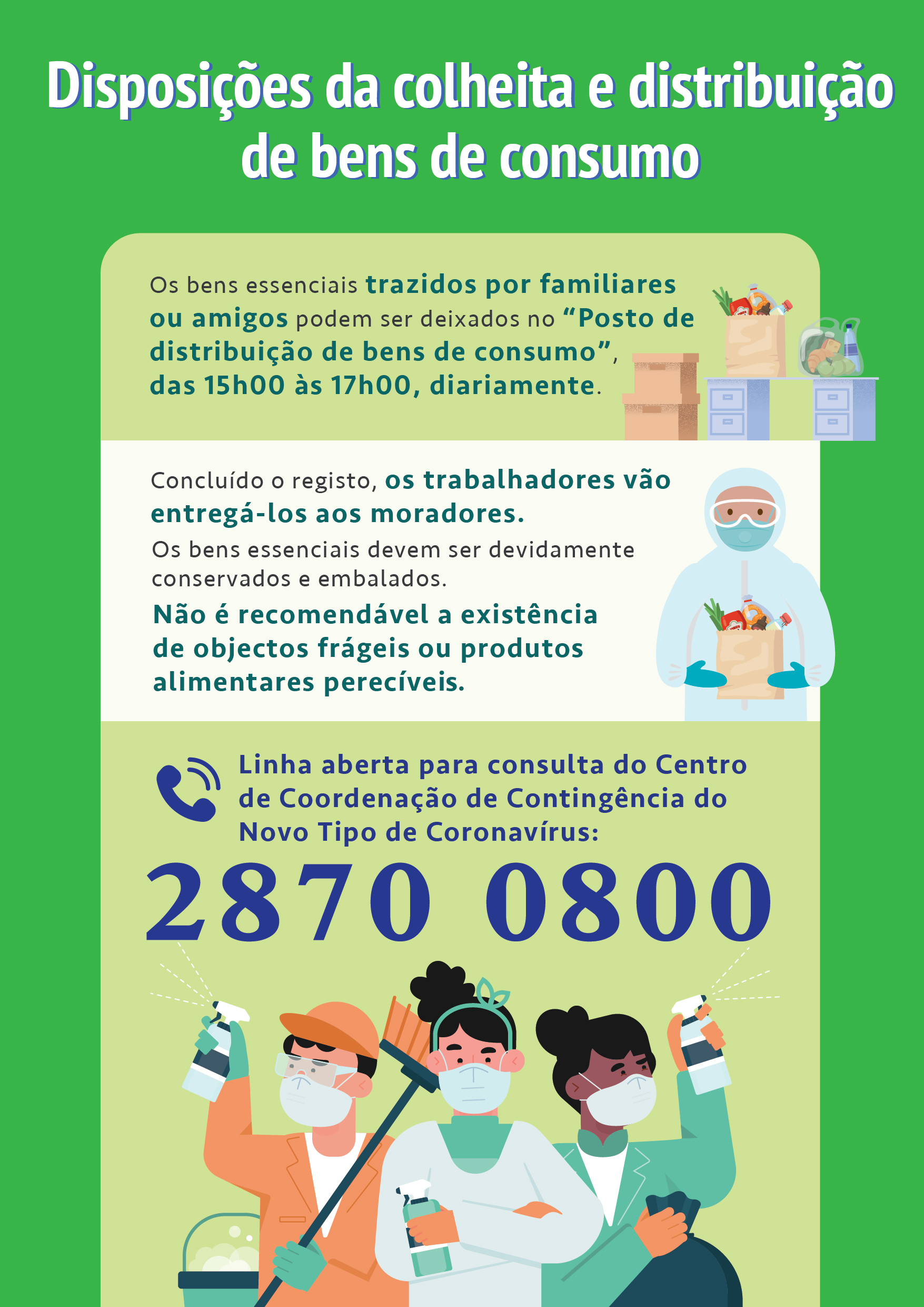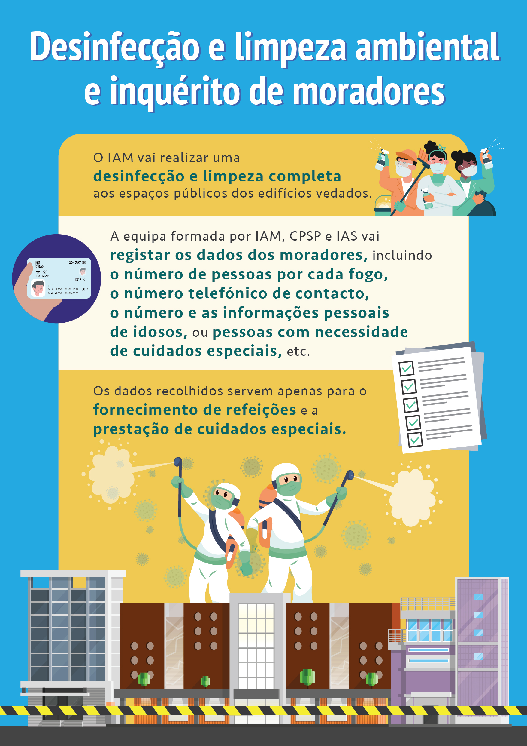 O Instituto para os Assuntos Municipais (IAM), o Corpo de Polícia de Segurança Pública (CPSP) e o Instituto de Acção Social (IAS) constituíram o Grupo de Apoio à Subsistência, o qual iniciou os trabalhos de averiguação aos moradores-alvo do edifício da Zona de Código de Saúde de Cor Vermelha para inteirar-se da quantidade real de moradores e das suas necessidades básicas, de forma a fornecer os artigos de subsistência. Ao mesmo tempo, tem-se empenhado em apoiar os Serviços de Saúde (SSM) a realizar, de forma ordenada, os trabalhos de amostragem de ácido nucleico viral a todos os moradores, divididos em grupo, no edifício vedado.