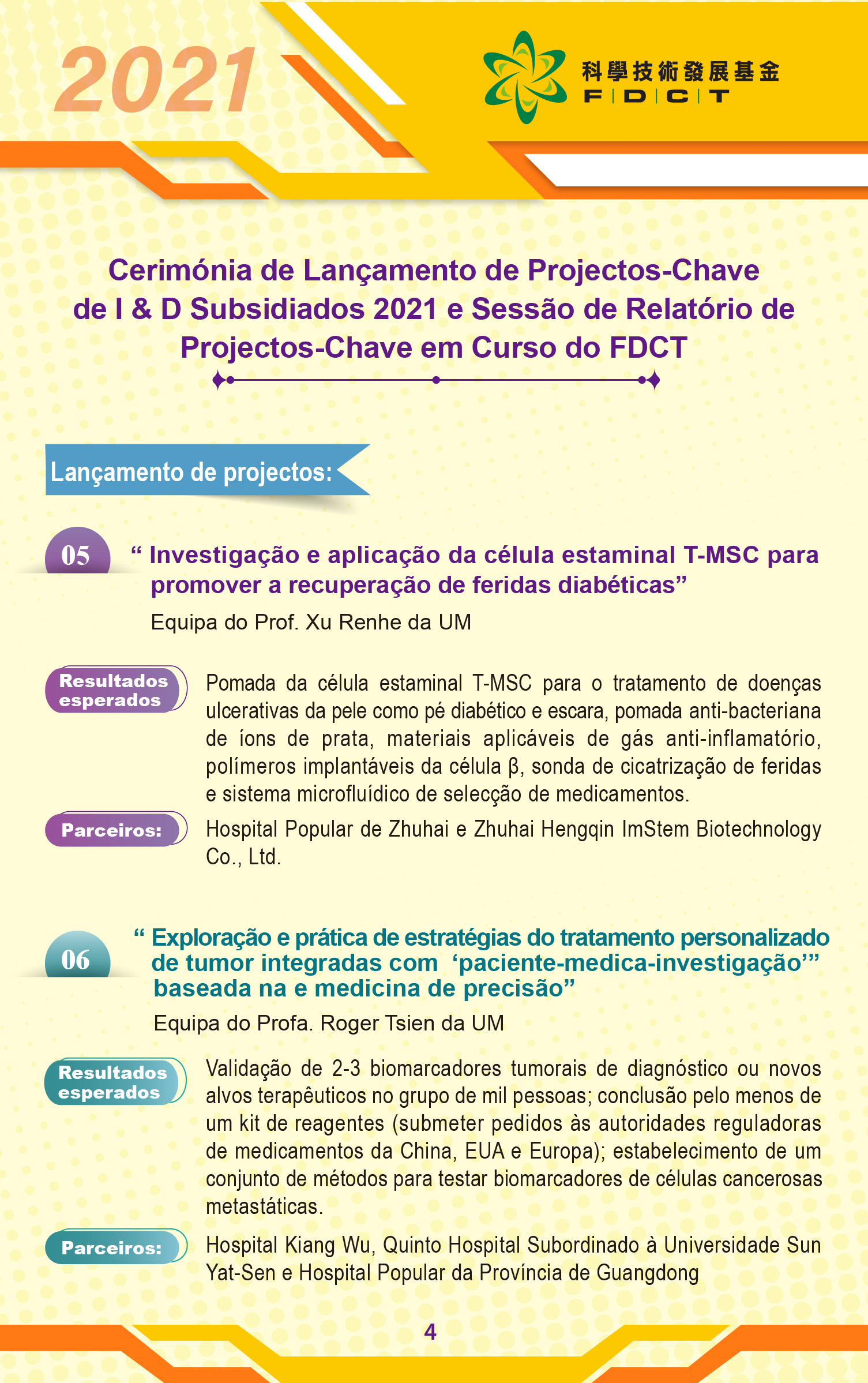 5. O projecto da equipa do Prof. Xu Renhe da UM, “Investigação e aplicação da célula estaminal T-MSC para promover a recuperação de feridas diabéticas”, em cooperação conjunta com o Hospital Popular de Zhuhai e a Zhuhai Hengqin ImStem Biotechnology Co., Ltd., tem por objectivo produzir a pomada da célula estaminal T-MSC para o tratamento regional de úlceras do pé diabético (DFU), promover a regeneração para acelerar a recuperação de DFU, e melhorar ainda o diagnóstico e tratamento auxiliar para DFU através de várias novas tecnologias biomédicas desenvolvidas com a UM.