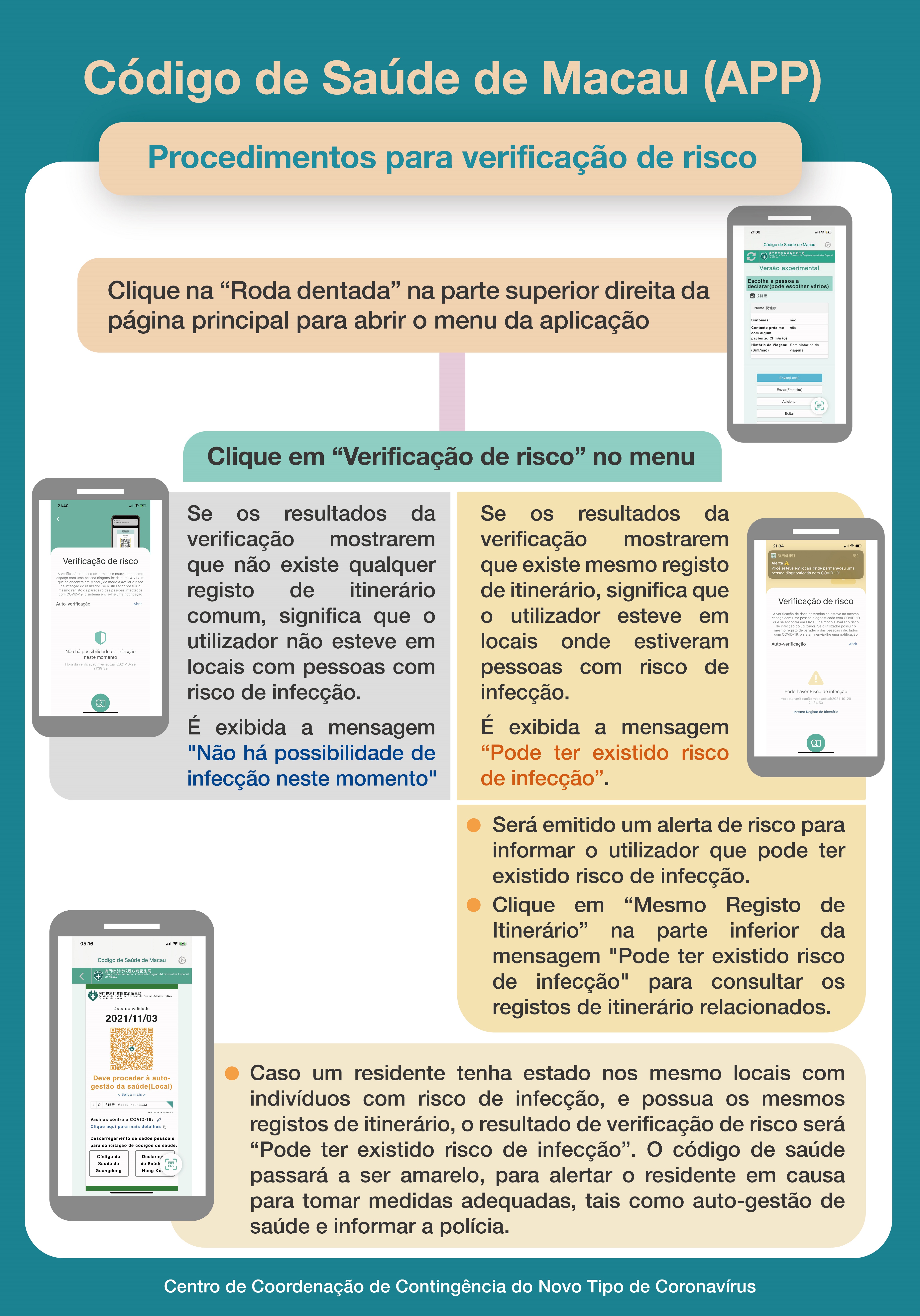 Além disso, o Centro de Coordenação de Contingência apela, mais uma vez, aos residentes para activarem a função de “verificação de risco” no “Código de Saúde”, de modo a conseguirem verificar o risco, de forma automática ou manual periodicamente. Aliás, os residentes devem manter a versão mais actualizada da aplicação do Código de Saúde, para poderem saber com a maior brevidade possível, se têm ou não, o mesmo itinerário com os infectados.
