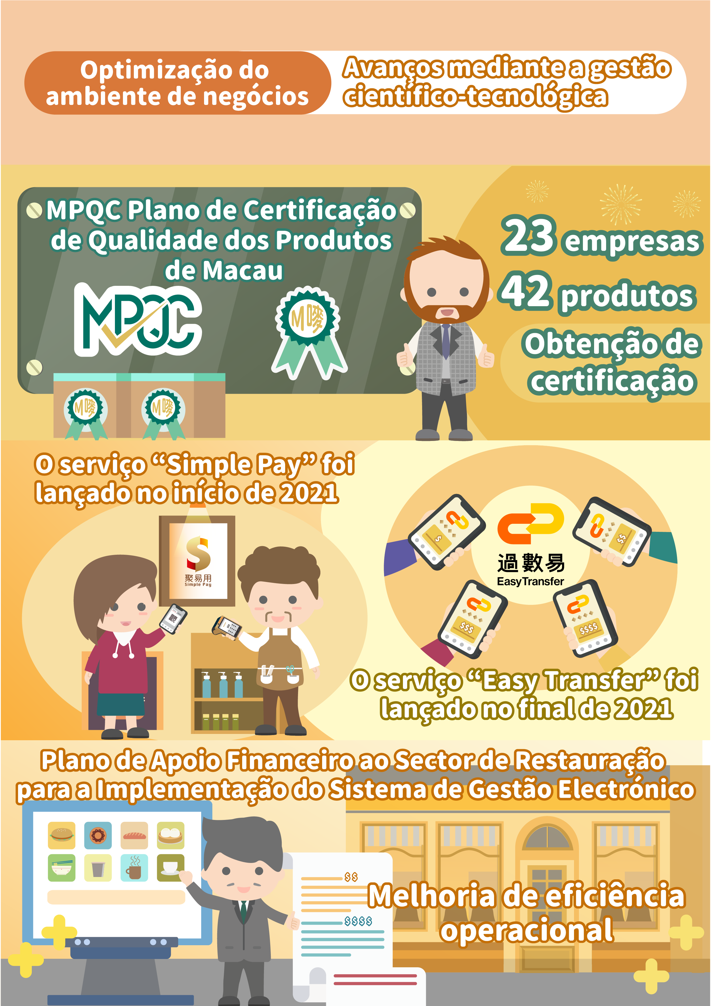 O Governo da RAEM tem envidado esforços na melhoria do ambiente comercial e na revitalização da economia comunitária e continuado a adoptar múltiplas medidas interdepartamentais para ajudar as empresas de Macau a elevar as suas competências e alargar a base industrial, apoiando o desenvolvimento sustentável de diversas indústrias.