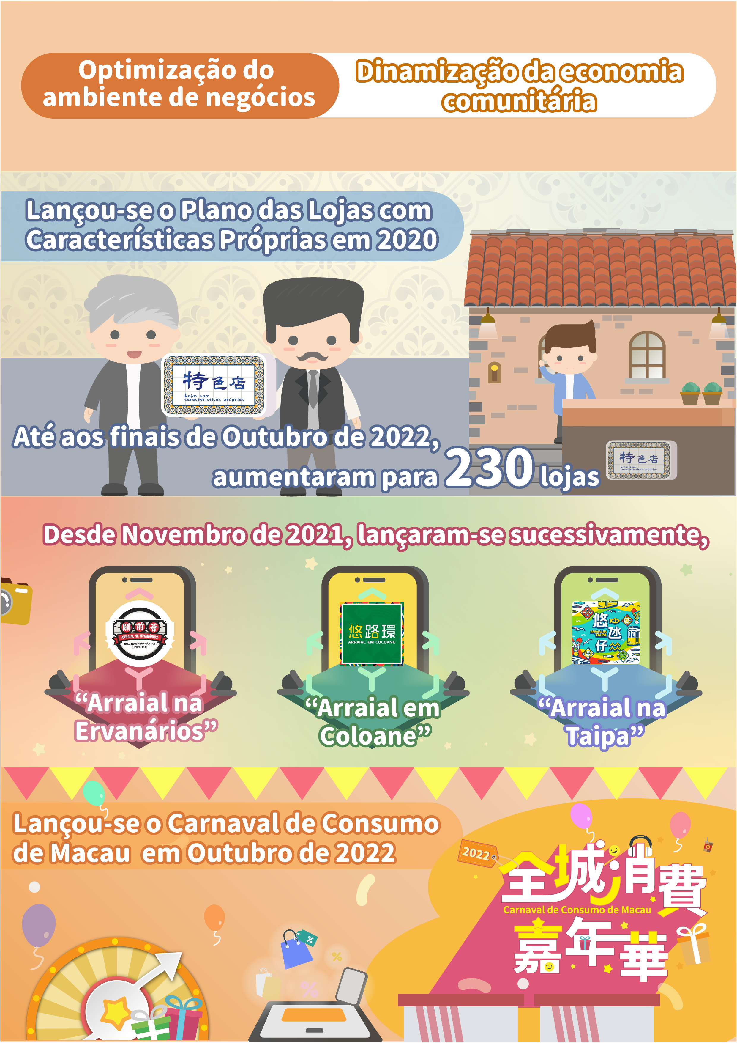 No intuito de revitalizar a economia comunitária, melhorando a situação operacional dos estabelecimentos comerciais, a DSEDT e as associações comerciais zonais, lançaram três actividades denominadas “Arraial na Ervanários” (na zona da Rua dos Ervanários), “Arraial em Coloane” (em Coloane) e “Arraial na Taipa (na Vila da Taipa), em Novembro de 2021, Abril e Setembro de 2022, respectivamente, nas quais aproveitaram a tecnologia para impulsionar o desenvolvimento de uma nova economia comunitária de experiência.