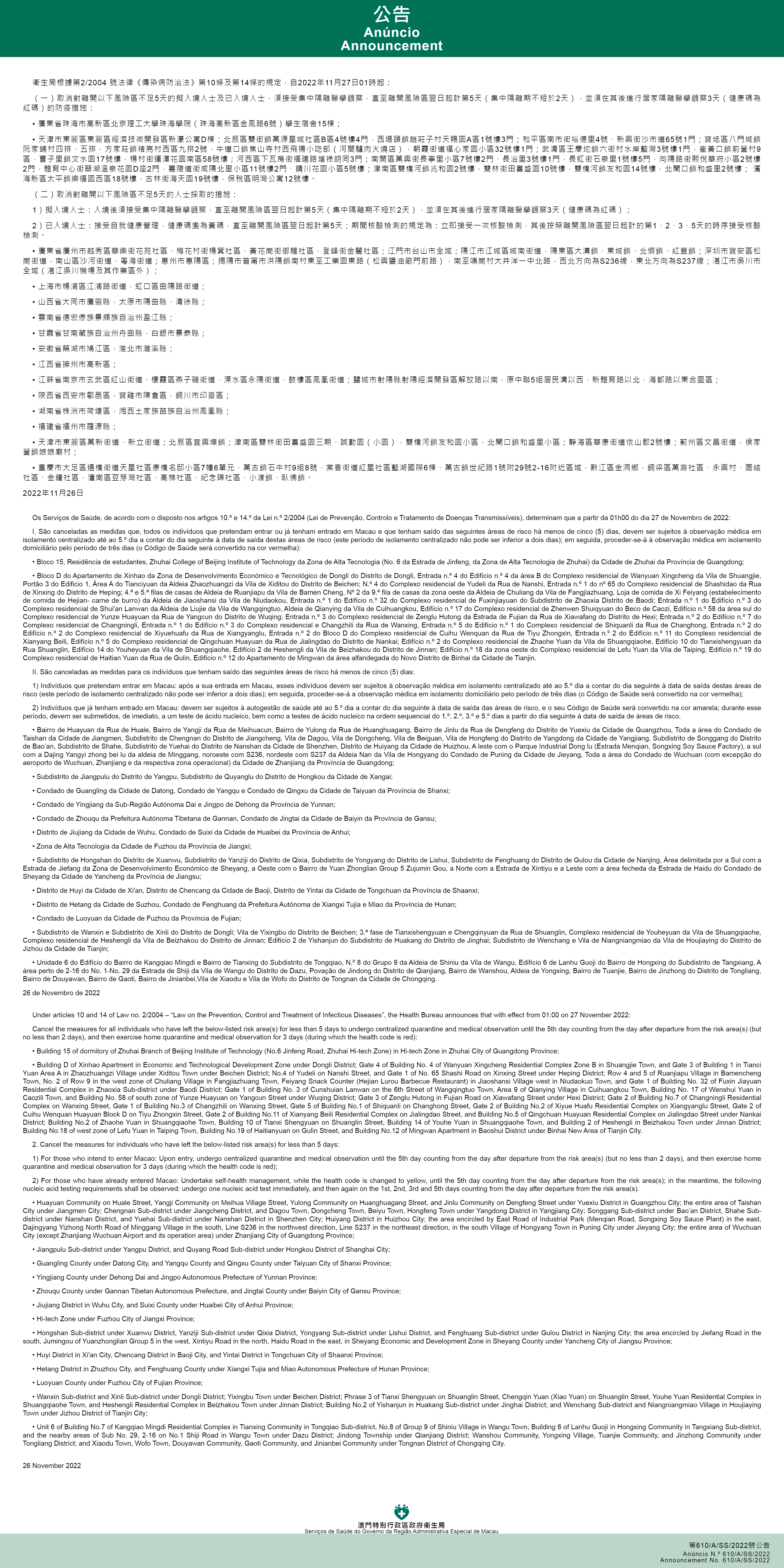 Tendo em consideração a evolução epidemiológica mais actualizada no Interior da China, os Serviços de Saúde, de acordo com o disposto nos artigos 10.º e 14.º da Lei n.º 2/2004 (Lei de Prevenção, Controlo e Tratamento de Doenças Transmissíveis), determinam que a partir da 01h00 do dia 27 de Novembro de 2022, são implementadas ou canceladas as medidas antiepidémicas para quem tenha estado em diversas áreas do Interior da China: