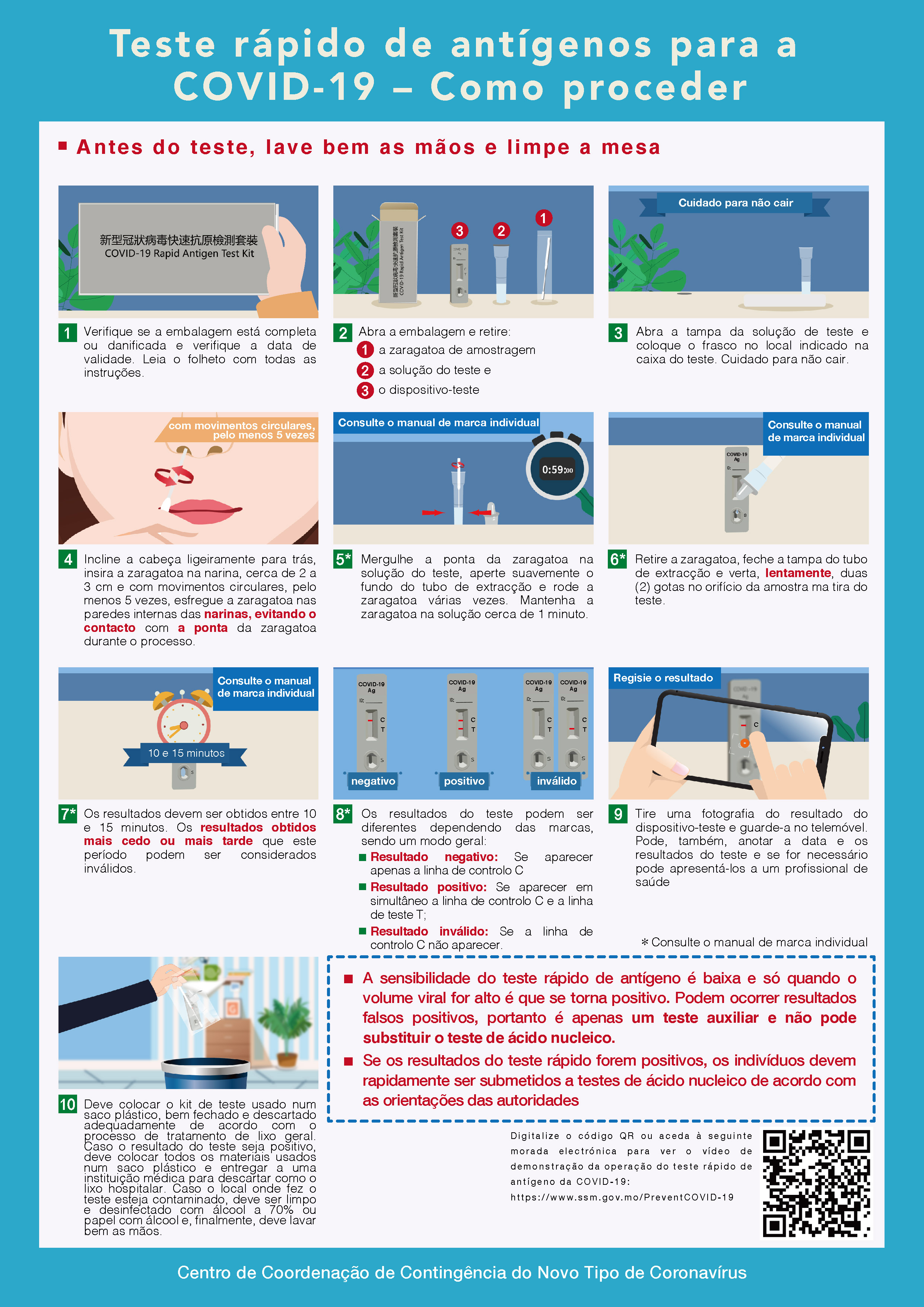 - Os procedimentos, declaração de resultado e precauções relativas ao uso do teste rápido de antigénio, estão disponíveis na página electrónica (https://www.ssm.gov.mo/apps1/covidagtest/pt.aspx#clg21693);