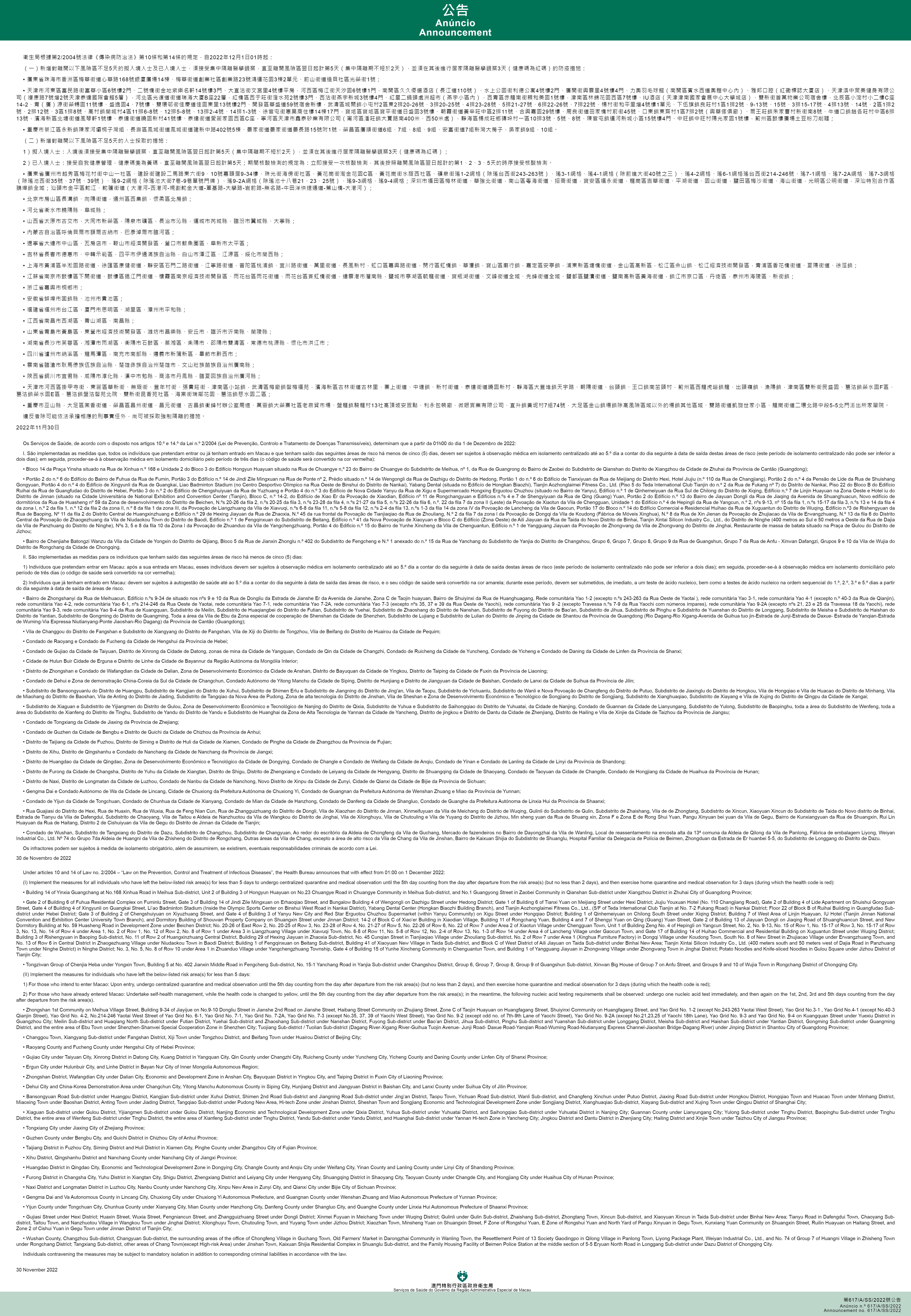 Tendo em consideração a evolução epidemiológica mais actualizada no Interior da China, os Serviços de Saúde, de acordo com o disposto nos artigos 10.º e 14.º da Lei n.º 2/2004 (Lei de Prevenção, Controlo e Tratamento de Doenças Transmissíveis), determinam que a partir da 01h00 do dia 1 de Dezembro de 2022, são implementadas ou canceladas as medidas antiepidémicas para quem tenha estado em diversas áreas do Interior da China: