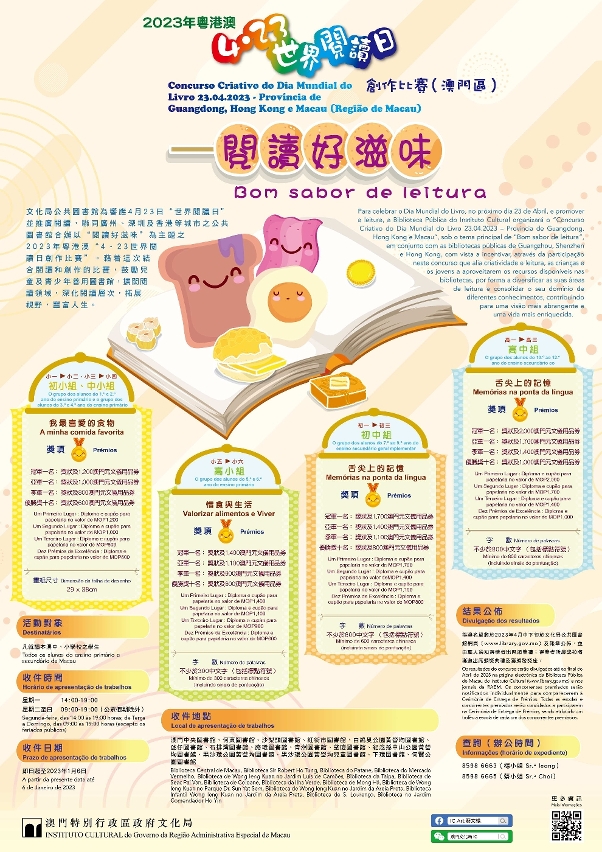 Para celebrar o Dia Mundial do Livro anualmente no dia 23 de Abril e promover a cultura da leitura, a Biblioteca Pública de Macau do Instituto Cultural, em colaboração com as bibliotecas de Guangzhou, Shenzhen e Hong Kong, organiza o “Concurso Criativo do Dia Mundial do Livro 23.04.2023 - Província de Guangdong, Hong Kong e Macau”, o qual este ano será dedicado ao tema “Bom sabor de leitura”. Por meio deste concurso que combina a leitura e a criatividade, pretende-se incentivar as crianças e os jovens a aproveitarem os recursos disponíveis nas bibliotecas, por forma a diversificar as suas áreas de leitura e consolidar o seu domínio de diferentes conhecimentos, contribuindo para uma visão mais abrangente e uma vida mais enriquecida. Os participantes no Concurso de Macau deverão entregar os seus trabalhos até ao dia 6 de Janeiro de 2023.