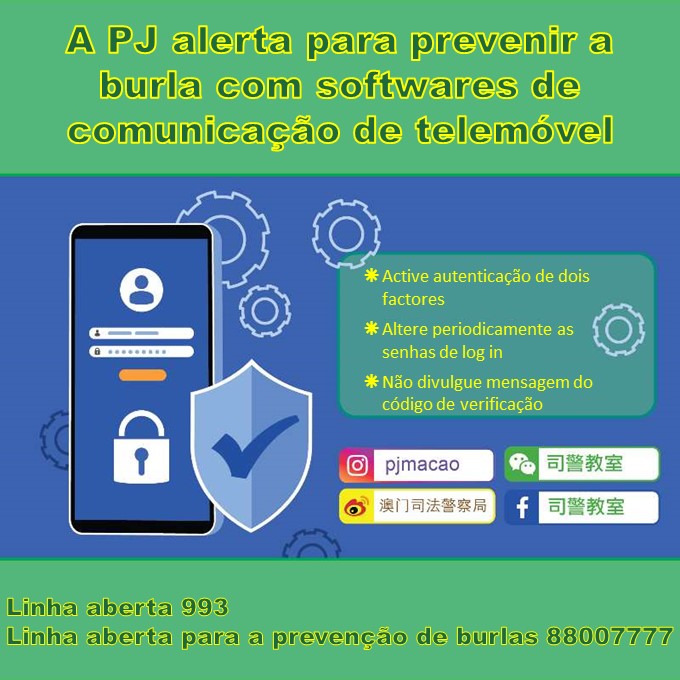Por esta razão, a PJ apela aos cidadãos para terem cuidado quando receberem chamada telefónica ou através de software de comunicação, e o interlocutor outro lado tenta iniciar a conversa de forma, por exemplo, “Adivinha quem sou eu?”. Se tal acontecer deve-se verificar a veracidade através de outro meio e não devem fazer logo a remessa de dinheiro, que lhes seja pedido para evitar eventual prejuízo futuro. A par disso, para garantir a segurança da conta de software de comunicação e evitar que a conta de software de comunicação seja usada por outra pessoa, deve activar a função de autenticação de dois factores e alterar periodicamente as senhas de log in, e não transmitir qualquer mensagem de autenticação para outra pessoa.