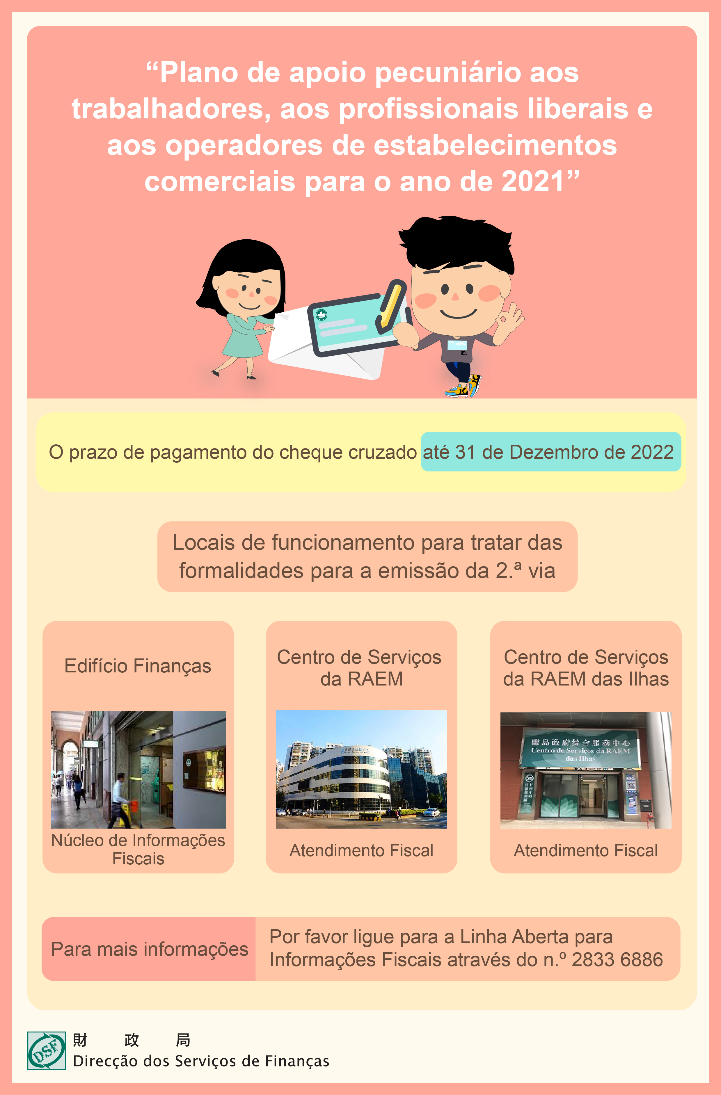 Nos termos do artigo 14.º do Regulamento Administrativo n.º 39/2021 “Plano de apoio pecuniário aos trabalhadores, aos profissionais liberais e aos operadores de estabelecimentos comerciais para o ano de 2021”, o prazo final para o pagamento dos cheques cruzados respeitantes ao plano de apoio vai até 31 de Dezembro de 2022. Se os beneficiários depositarem os cheques cruzados num banco que não seja o banco agente designado para efeitos de pagamento (nomeadamente, o Banco Nacional Ultramarino), estes cheques necessitam ser apresentados à compensação e depois entregues ao banco agente designado para efeitos de pagamento. Por esta razão, os beneficiários dos cheques devem informar-se da “Tramitação e Regras interbancárias locais sobre a compensação dos cheques” dos bancos receptores e reservar tempo suficiente para evitar que ocorram situações de impedimento no pagamento do cheque devido ao tempo necessário para a compensação.
