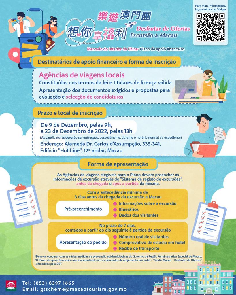As agências de viagens locais interessadas em participar no plano de apoio financeiro “Desfrutar de Ofertas.Excursão a Macau” devem, até 23 de Dezembro de 2022, entregar os documentos requeridos para efeitos de apreciação, dentro do horário de expediente, na Direcção dos Serviços de Turismo (Balcão de atendimento da DST, sito na Alameda Dr. Carlos d'Assumpção, n.os 335-341, Edifício “Hot Line”, 12.º andar, Macau). Os pormenores do plano e processo de apreciação estão disponíveis na página electrónica da DST: https://industry.macaotourism.gov.mo/pt/page/content.php?page_id=21403. Para mais informações enviar email para: gtscheme@macaotourism.gov.mo ou ligar através do telefone n.º (853) 8397 1665.