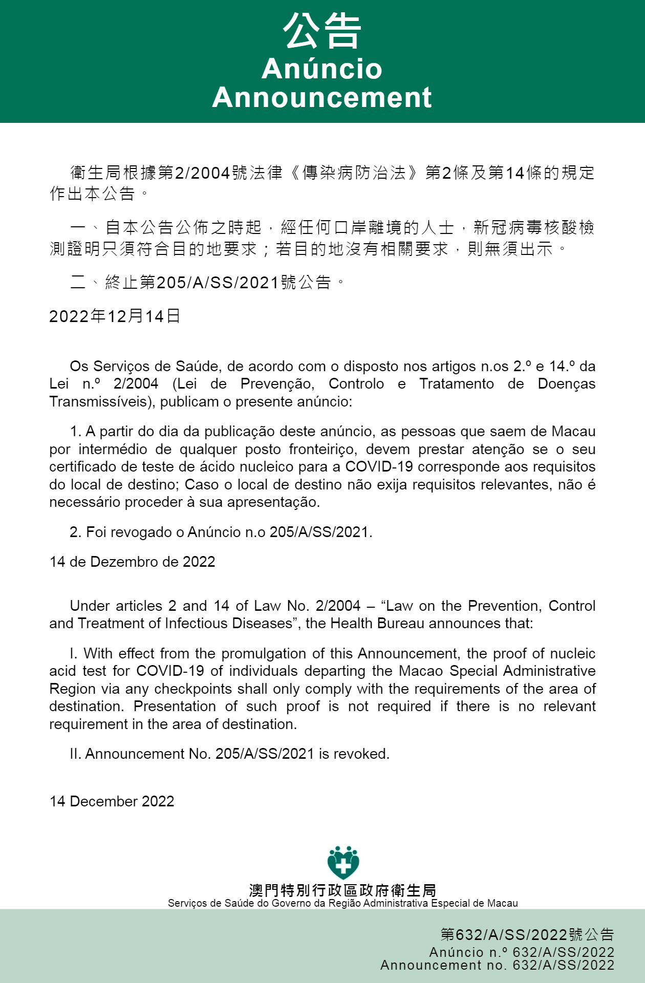 O Centro de Coordenação de Contingência do Novo Tipo de Coronavírus (adiante designado por Centro) informa que os Serviços de Saúde publicaram o Anúncio n.º 632/A/SS/2022, de acordo com o disposto nos artigos nos 2.º e 14.º da Lei n.º 2/2004 (Lei de Prevenção, Controlo e Tratamento de Doenças Transmissíveis), a partir do dia 14 do corrente mês, as pessoas que saem de Macau por intermédio de qualquer posto fronteiriço, devem prestar atenção se o seu certificado de teste de ácido nucleico para a COVID-19 corresponde aos requisitos do local de destino; Caso o local de destino não exija requisitos relevantes, não é necessário proceder à sua apresentação; O Centro também apela aos residentes para prestarem atenção e cooperarem com os requisitos de certificado do teste de ácido nucleico do local de destino antes de viajar.