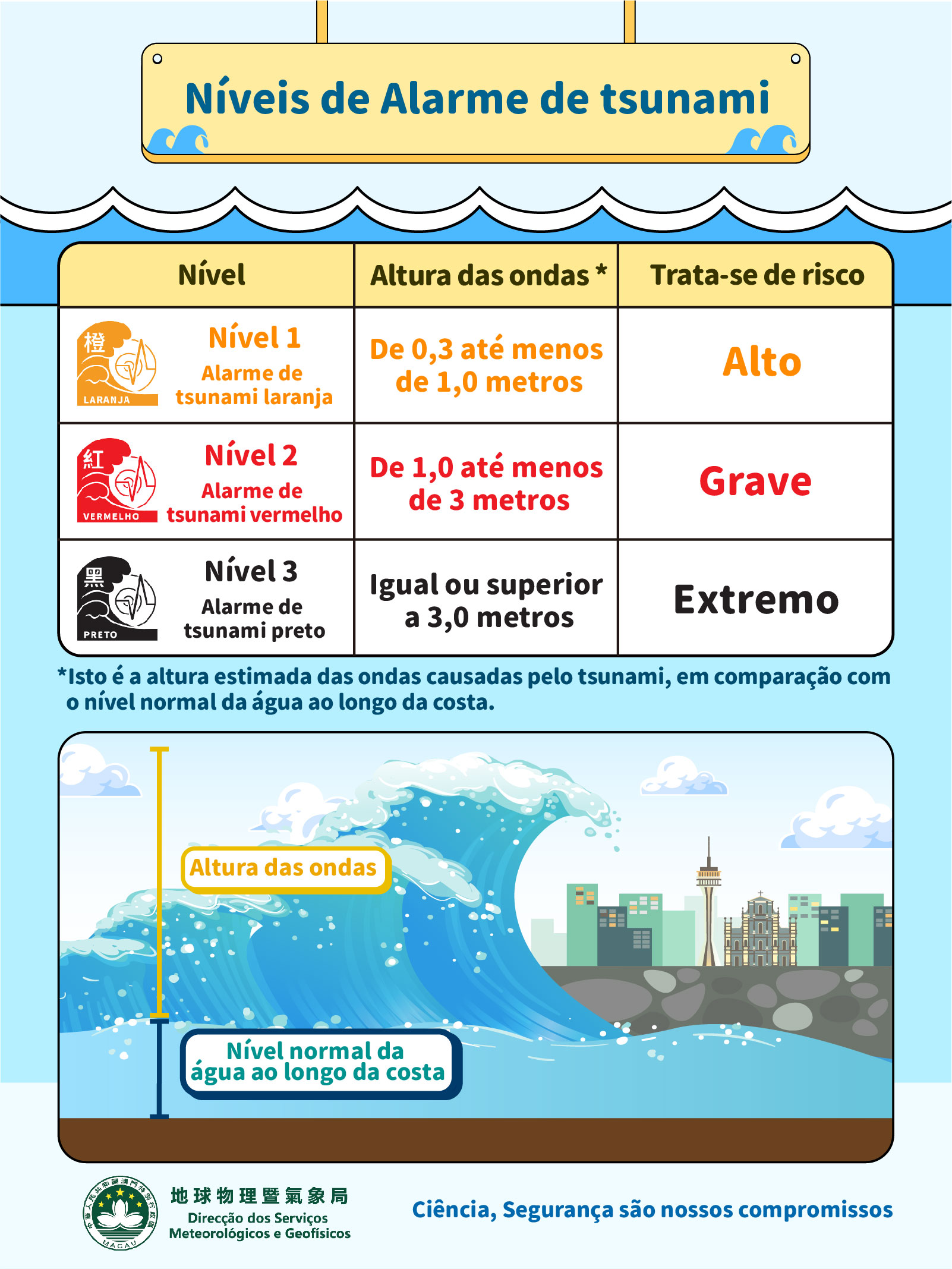 O Sistema de Alarme de Tsunami é classificado em três níveis: laranja, vermelho e preto de acordo com a altura das ondas de tsunami que afecta Macau, e de maneira a refletir o grau de risco e o seu impacto na área marítima de Macau.