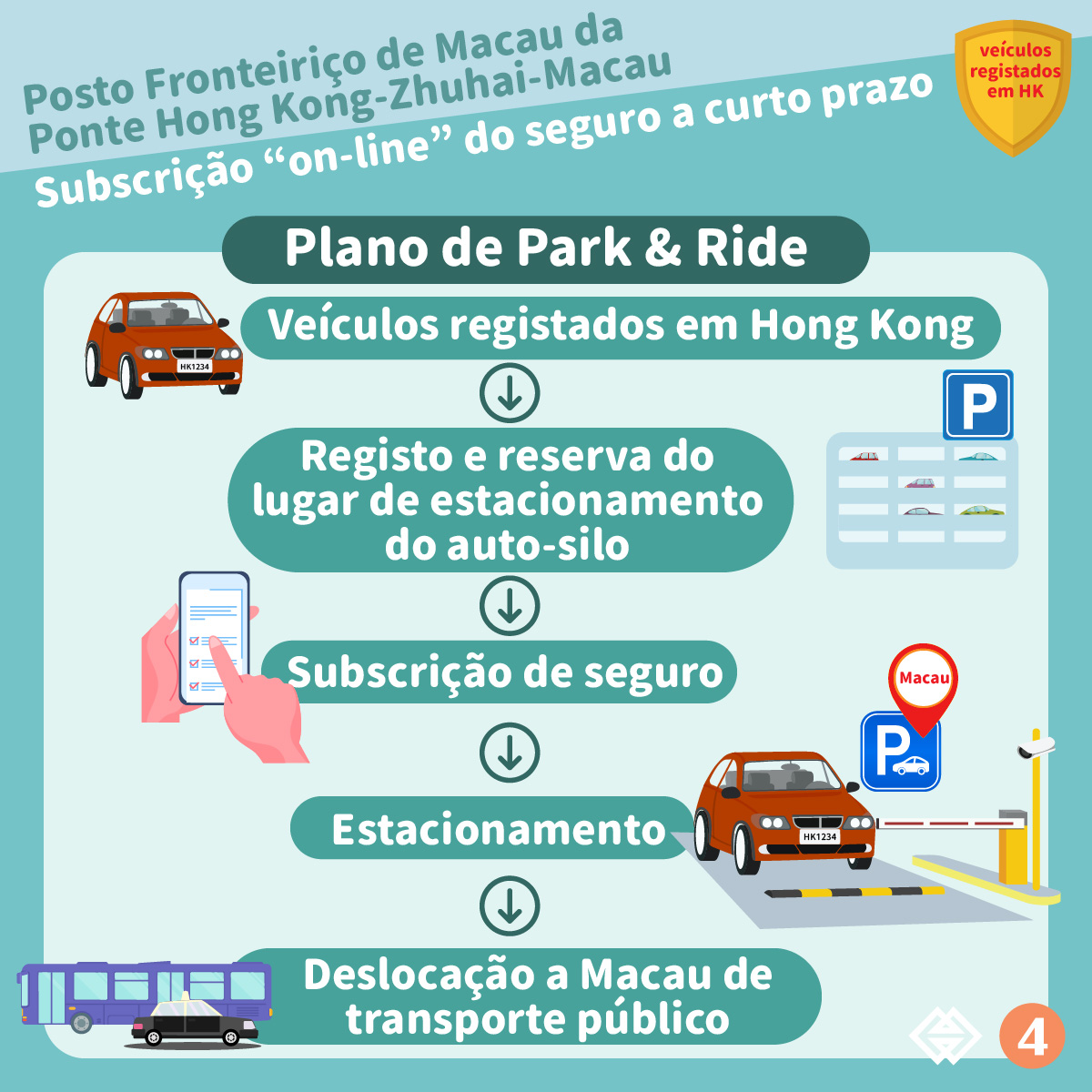 Assim que os proprietários de veículos registados em Hong Kong completem o registo através do “Online parking space reservation system- East Car Park of the border checkpoint building of the Hong Kong-Zhuhai-Macao Bridge” da Direcção dos Serviços para os Assuntos de Tráfego e reservem com sucesso um lugar de estacionamento no Auto-Silo Este do Posto Fronteiriço da Ponte Hong Kong-Zhuhai-Macau, os mesmos podem subscrever o seguro a curto prazo com uma duração de 9 dias junto das seguradoras de Macau que participam no plano em causa através de auto ligação à plataforma de subscrição de seguro. A plataforma de subscrição de seguro inciou o seu funcionamento a partir das 18 horas do dia 30 de Dezembro de 2022.