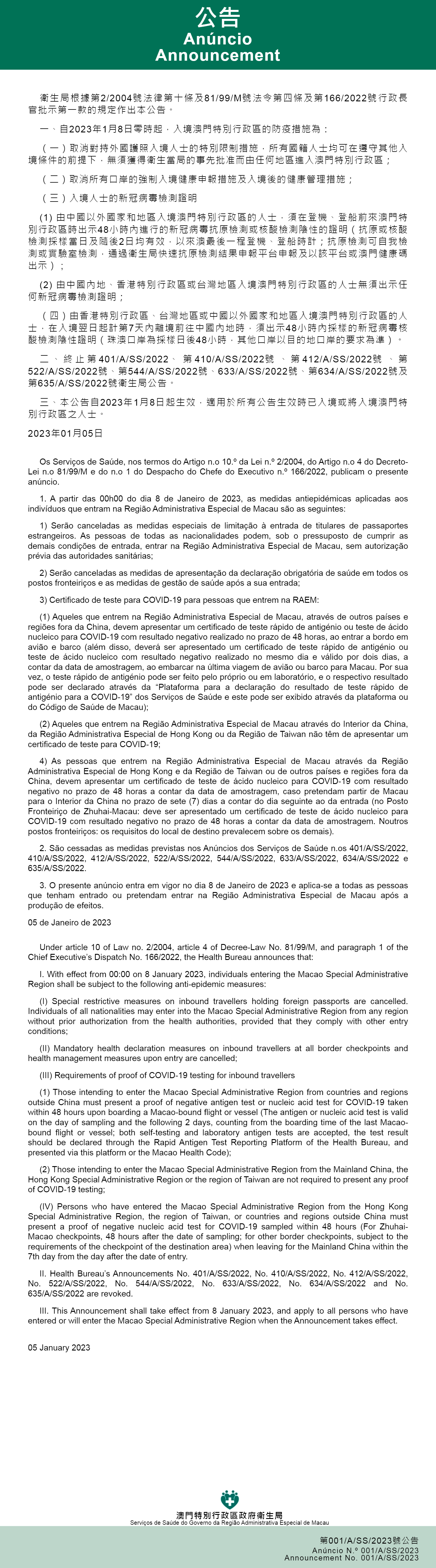 O Centro de Coordenação de Contingência do Novo Tipo de Coronavírus anunciou que, no dia 5 de Janeiro de 2023, foram publicados os Despachos do Chefe do Executivo n.os 1/2023 e 2/2023 no Boletim Oficial da Região Administrativa Especial de Macau, revogando os Despachos do Chefe do Executivo n.os 80/2020 e 43/2021. Por sua vez, os Serviços de Saúde também elaboraram o Anúncio n.o 001/A/SS/2023 para actualizar as medidas de prevenção epidémica para a entrada em Macau e pessoas em trânsito. A partir das 00:00 do dia 8 de Janeiro de 2023, as seguintes medidas entrarão em vigor: