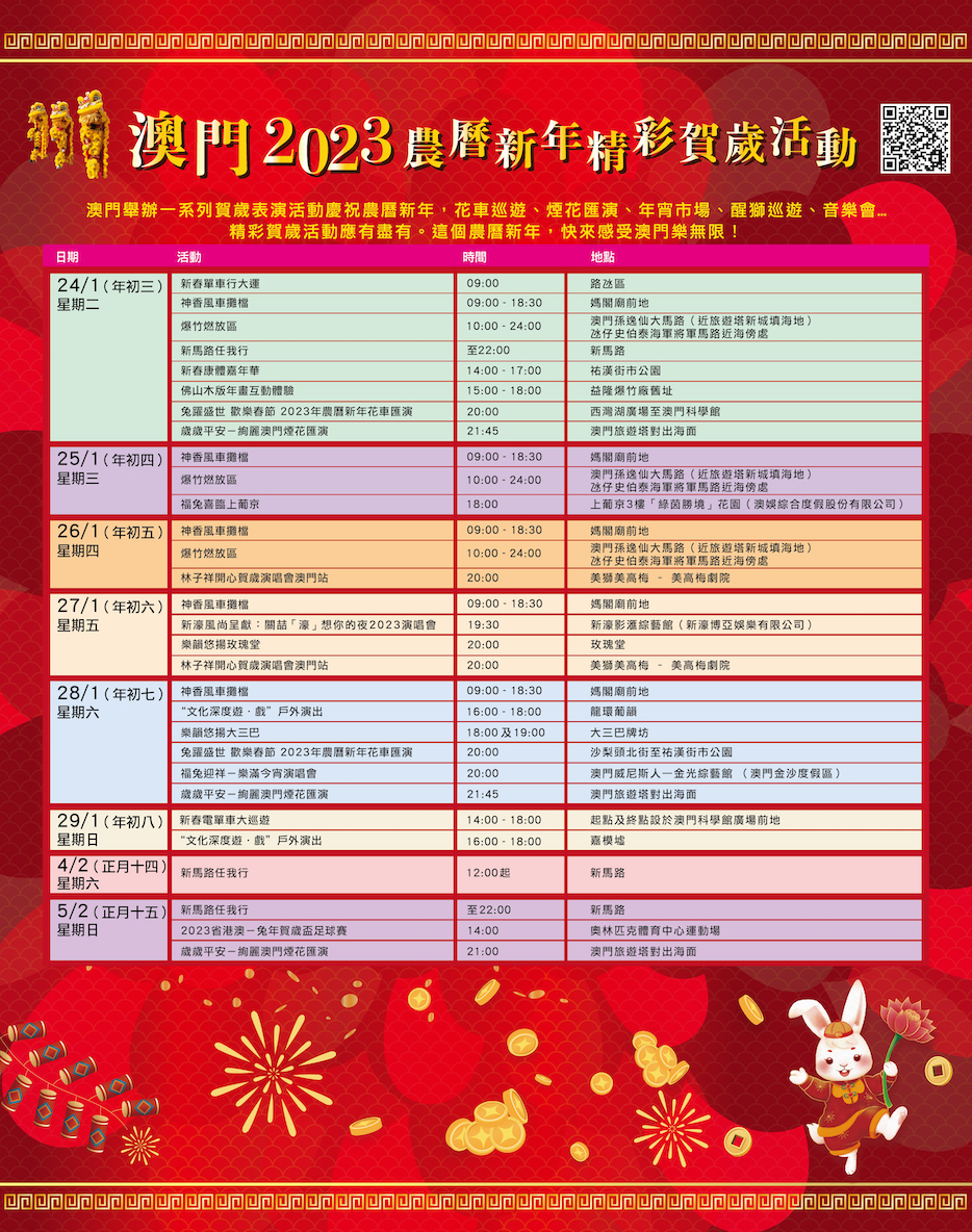 A DST tem envidado esforços para que visitantes de todas as partes venham a Macau experienciar as ofertas de “turismo +” com actividades destinadas ao Festival da Primavera. No primeiro dia do Ano Novo Lunar (22 de Janeiro), a DST organiza o desfile do dragão dourado, no terceiro (24 de Janeiro) e sétimo dias (28 de Janeiro) do Ano Novo Lunar a Parada de Celebração do Ano do Coelho, no terceiro dia (24 de Janeiro), no sétimo dia do Ano Novo Lunar (28 de Janeiro) e no dia do Festival das Lanternas (5 de Feveiro) espectáculos de fogo-de-artifício, a par com a exibição de carros alegóricos e jogos online, entre outras actividades, para permitir aos residentes e visitantes sentir a atmosfera festiva do Ano Novo Lunar em Macau.