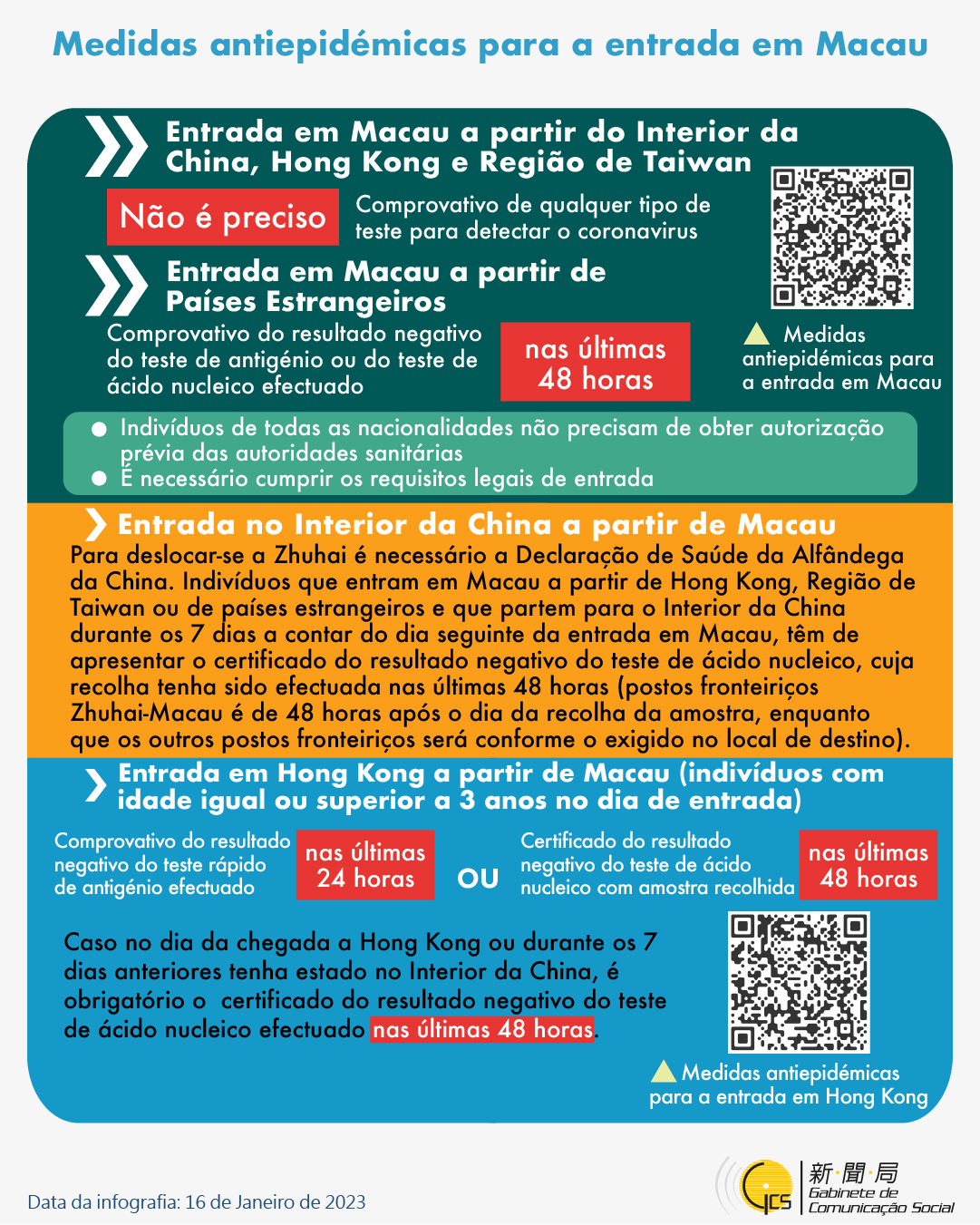 (Infografia) Medidas antiepidémicas para a entrada em Macau (16 de Janeiro de 2023).