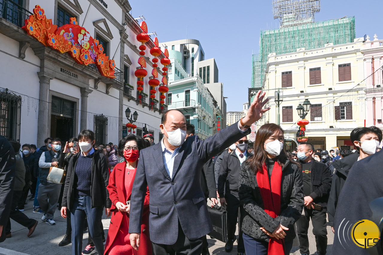 O Chefe do Executivo, Ho Iat Seng, e a esposa, acompanhados pela secretária para os Assuntos Sociais e Cultura, Ao Ieong U, Chefe do Gabinete do Chefe do Executivo, Hoi Lai Fong, e presidente do Instituto Cultural, Leong Wai Man, chegaram esta manhã, cerca das 11h00, à Rua de Cinco de Outubro, começando um passeio por vários locais da cidade, nomeadamente o Largo do Pagode do Bazar, a Avenida de Almeida Ribeiro, a Rua da Felicidade e o Largo do Senado. Durante o passeio, Ho Iat Seng apresentou aos comerciantes as saudações festivas e desejos de bons negócios. Aproveitou a oportunidade para conversar com comerciantes e ficar a conhecer a situação dos negócios, com a maioria deles a elogiar a iniciativa “Passeando pela Almeida Ribeiro – Projecto piloto para área pedonal”, e a indicar que traz muitos turistas a Macau, disseram ainda que o negócio está a recuperar de forma gradual, e que, por essa razão, estão confiantes que a situação fique cada vez melhor.