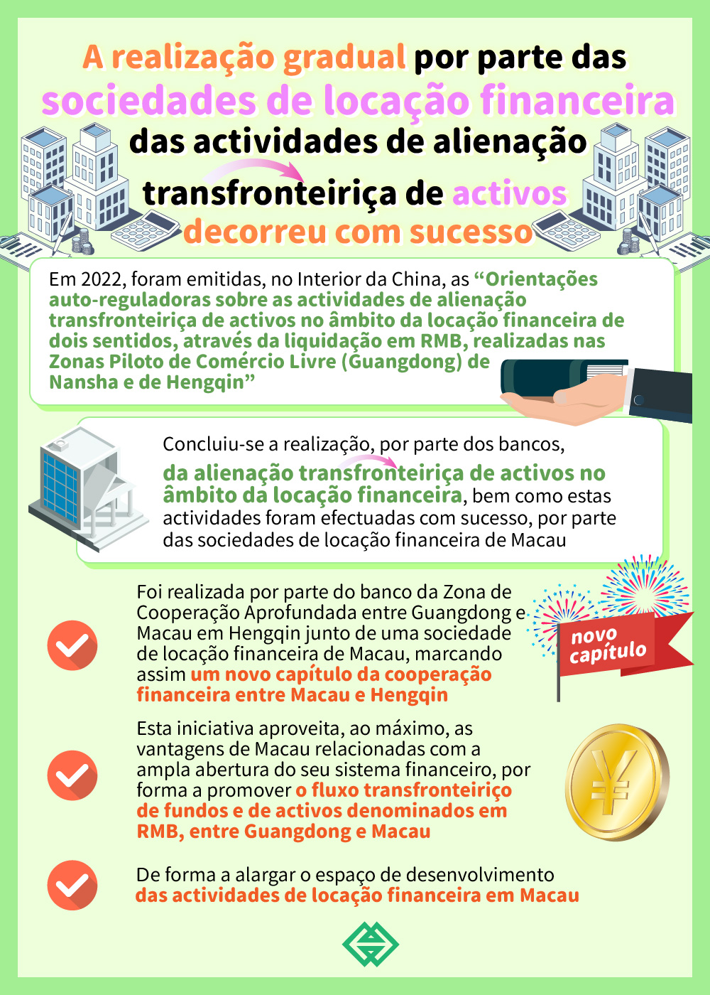 A fim de promover o desenvolvimento do sector financeiro moderno de Macau, a AMCM continua a manter-se em comunicação com os ministérios competentes do Interior da China, de modo a procurar o seu apoio nesta área. Em Abril de 2022, foram emitidas, no Interior da China, as “Orientações auto-reguladoras sobre as actividades de alienação transfronteiriça de activos no âmbito da locação financeira de dois sentidos, através da liquidação em RMB, realizadas nas Zonas Piloto de Comércio Livre (Guangdong) de Nansha e de Hengqin”, as quais permitem a realização da alienação transfronteiriça de activos no domínio de locação financeira de dois sentidos, por parte dos bancos localizados nessa Zonas de Comércio Livre de Nansha e de Hengqin e das instituições estrangeiras, incluindo as provenientes de Macau, sendo que estas actividades são liquidadas em RMB, tendo como objectivo contribuir para o desenvolvimento dos actividades de locação financeira em Macau em termos da expansão da sua dimensão.