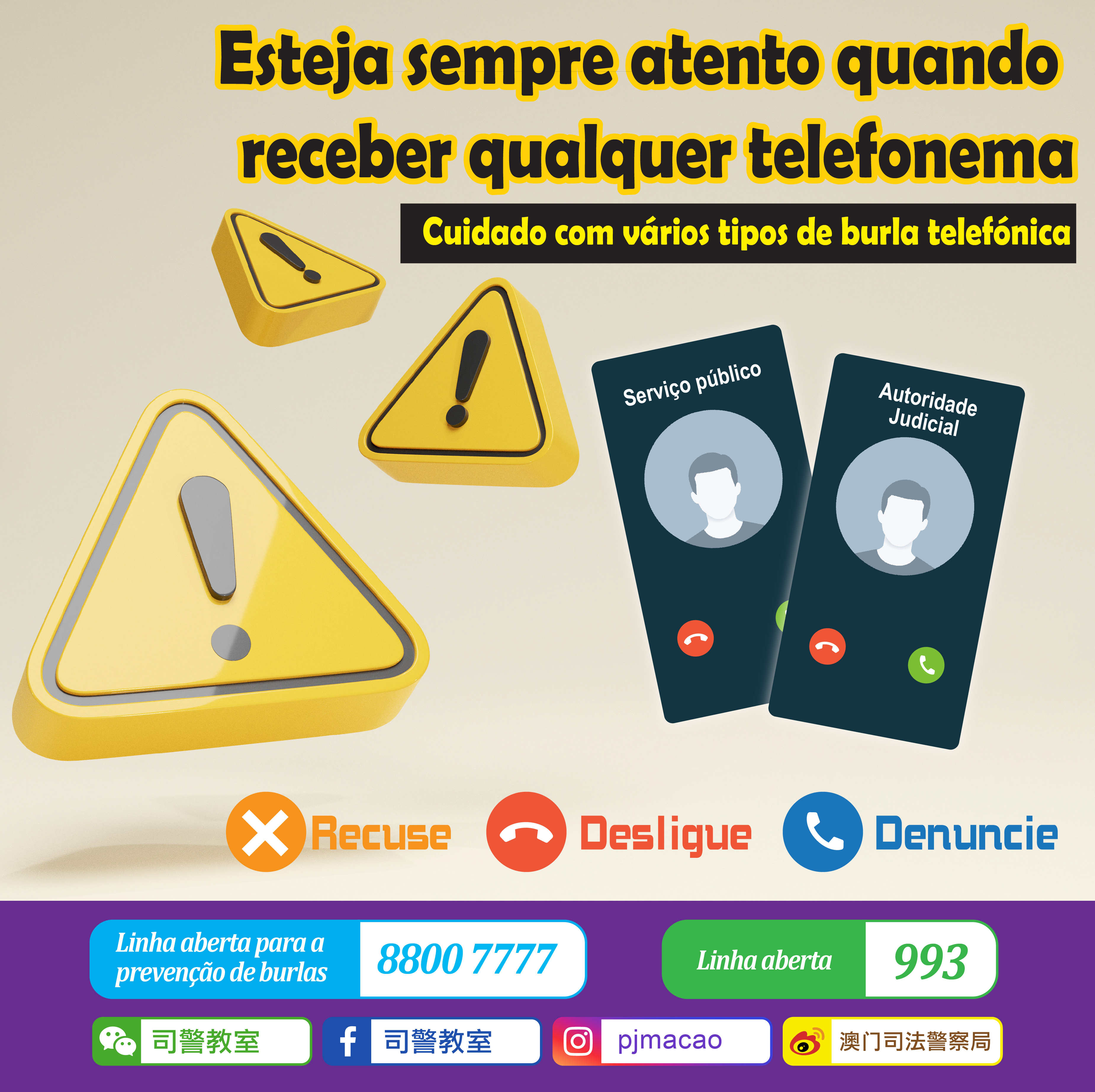 Dado aos muitos casos de fraude telefónica deste género nos últimos dias, a PJ apela novamente os cidadãos a estarem sempre atentos para não darem oportunidade aos criminosos a roubarem os dados pessoais ou dinheiro. Quando receber chamada deste tipo, deve confirmá-la através de um meio confiável.