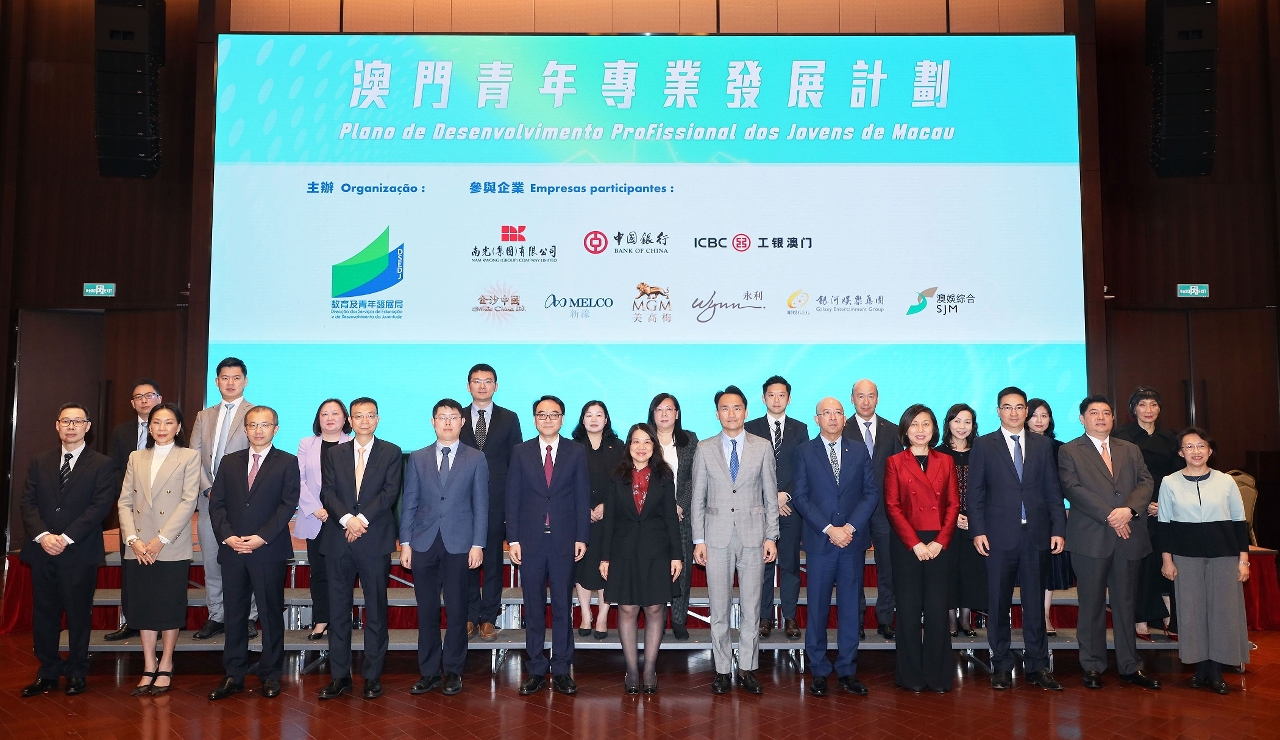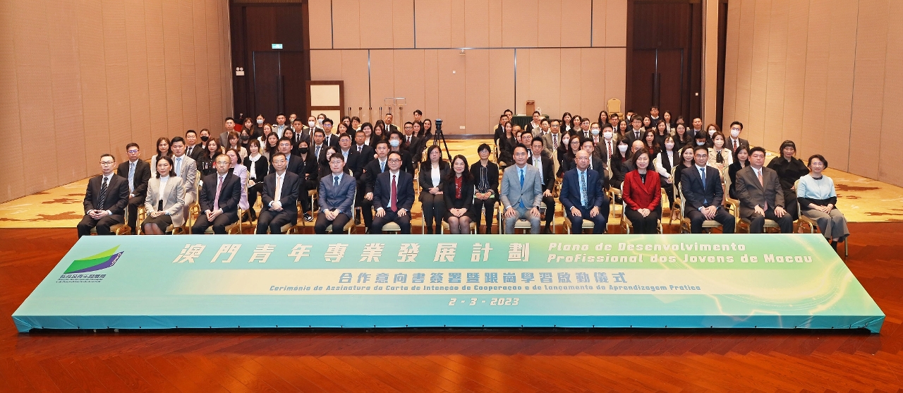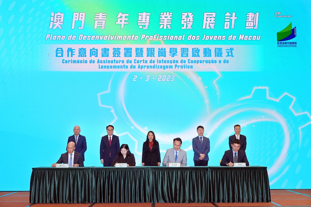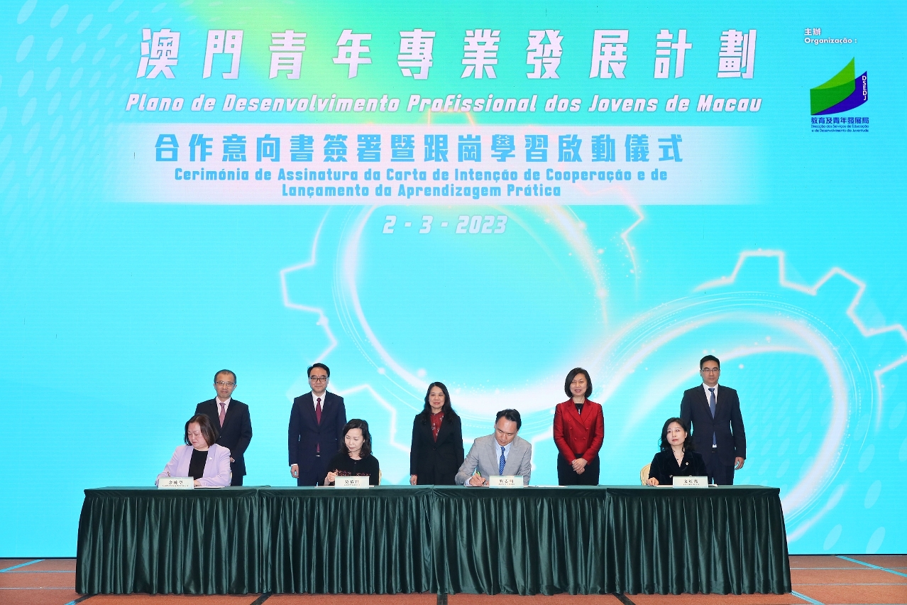 Para promover o desenvolvimento profissional dos jovens trabalhadores, a Direcção dos Serviços de Educação e de Desenvolvimento da Juventude (DSEDJ) realizou, no dia 2 de Março de 2023, a “Cerimónia de Assinatura da Carta de Intenção de Cooperação e de Lançamento da Aprendizagem Prática do Plano de Desenvolvimento Profissional dos Jovens de Macau”. Sob o testemunho da Chefe do Gabinete da Secretária para os Assuntos Sociais e Cultura, Ho Ioc San, do Chefe do Departamento de Educação e Assuntos de Juventude do Gabinete de Ligação do Governo Popular Central na Região Administrativa Especial de Macau, Li Xuefei e dos representantes das empresas participantes, o Director da DSEDJ, Kong Chi Meng, assinou as cartas de intenção com os representantes das noves grandes empresas de Macau, nomeadamente, a Nam Kwong União Comercial e Industrial, Limitada, o Banco da China Limitada, Sucursal de Macau, o Banco Industrial e Comercial da China (Macau), S.A., Venetian Macau, S.A., Melco Resorts & Entertainment Limited, MGM Grand Paradise, S.A., Wynn Resorts (Macau), S.A., Galaxy Entertainment Group, e SJM Resorts, S.A., bem como foi anunciado o início oficial da segunda fase, que contemplará a aprendizagem prática.