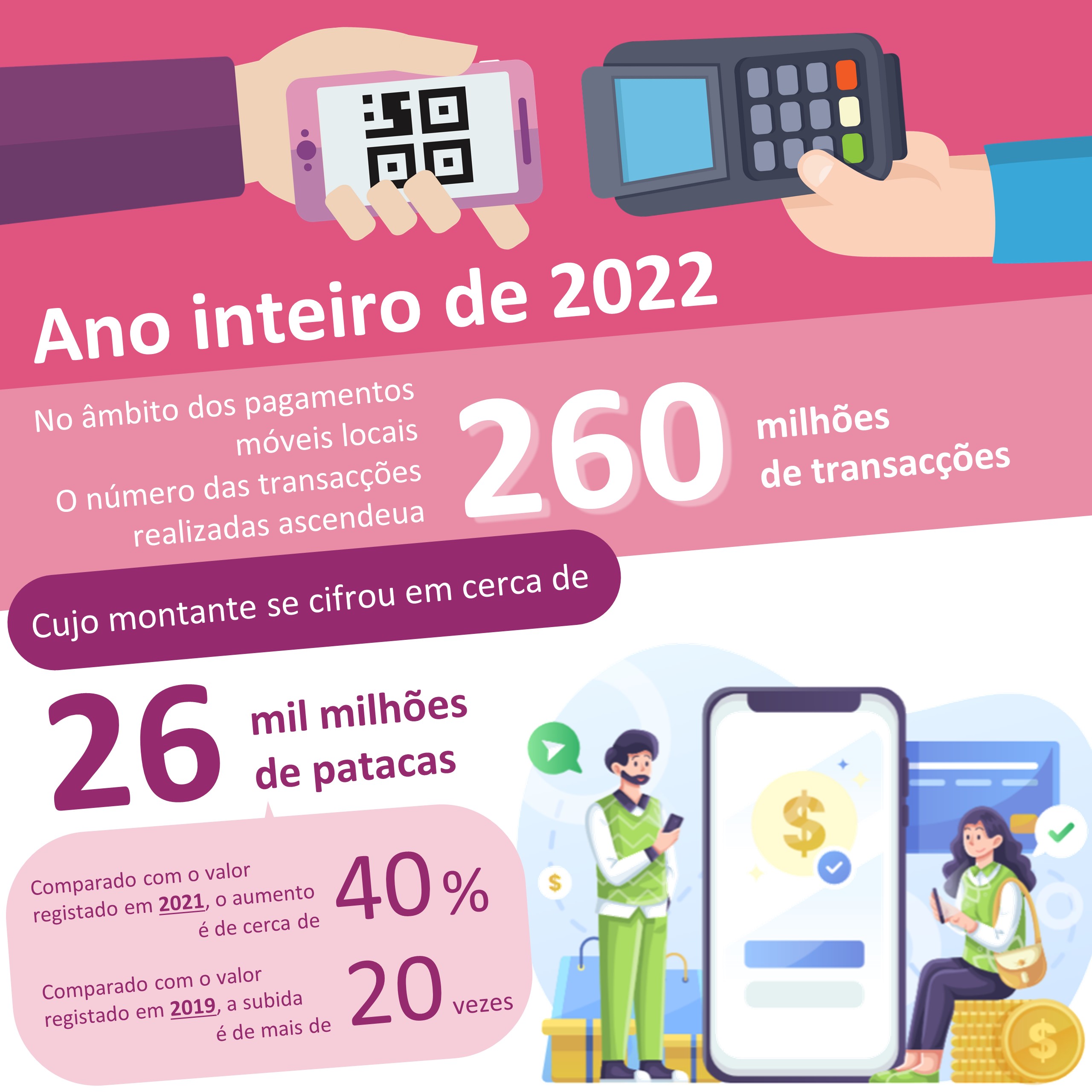 A Autoridade Monetária de Macau informou que a utilização e a aceitação de pagamentos móveis em Macau continua a expandir-se, em ordem a desempenhar, de forma plena, o seu importante papel na promoção do desenvolvimento económico de Macau, impulsionando, também, o desenvolvimento das actividades financeiras digitais. Em 2022, foram realizadas 260 milhões de transacções de pagamentos móveis locais, tendo-se registado um novo recorde, no valor de de 26 mil milhões de patacas, o que corresponde a um aumento de cerca de 40% e a uma subida significativa de mais de 20 vezes, quando comparado com o valor registado em 2021 e em 2019, respectivamente.